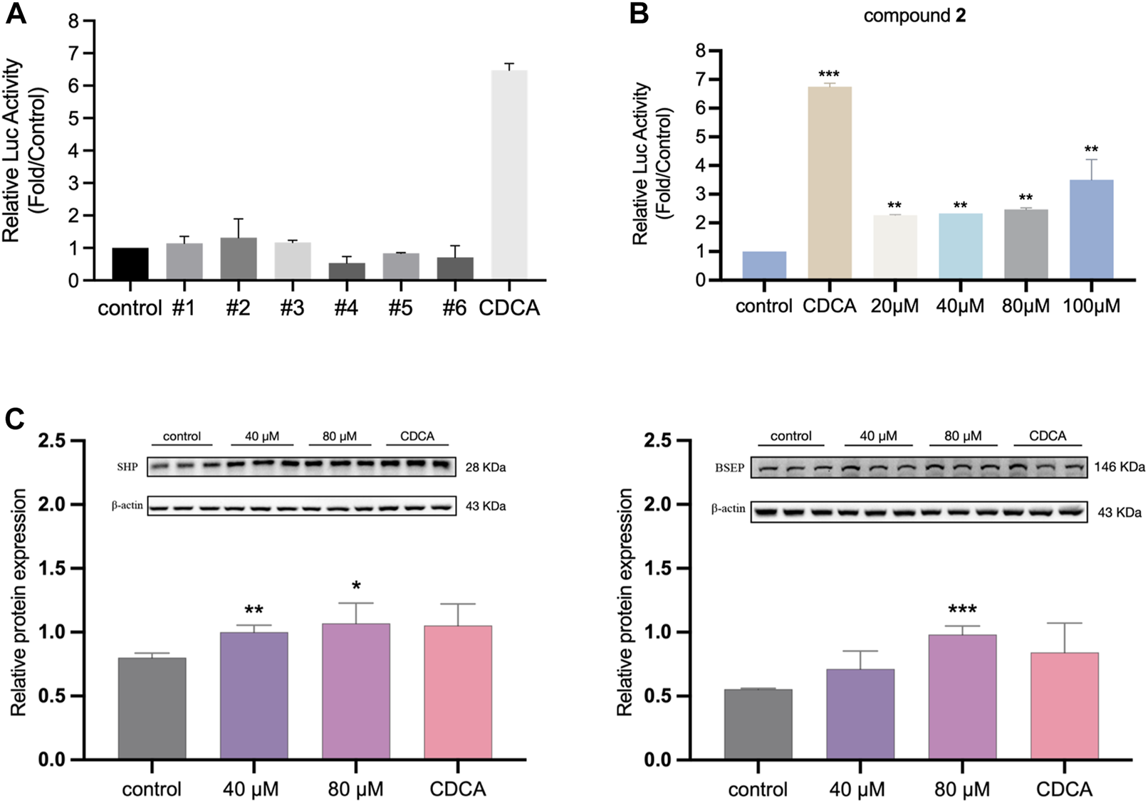 (A) The relative luciferase activities of six candidate compounds were evaluated at a single concentration of 20 µM (B) The relative luciferase activities of compound 2 in a concentration-dependent manner (*p < 0.05, **p < 0.01, ***p < 0.001 vs control group; data is expressed as mean ± SD.). (C) Western blot analysis for FXR, SHP and BSEP expressions after treatment 24 h in HepG2 cells (n = 3, data is shown as mean ± SD. *p < 0.05, **p < 0.01, ***p < 0.001 vs. control group.).