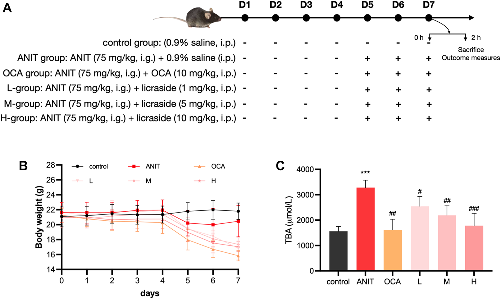 Animal experiment results (A) Experimental protocol: the scheme outlining the design and timeline of the animal experiments (B) Body weight: the body weight of mice in each experimental group. Data are shown as mean ± SD. with n = 8 per group (C) TBA level in bile: the levels of TBA in each experimental group (*p < 0.05, **p < 0.01, ***p < 0.001 vs. control group; #p < 0.05, ##p < 0.01, ###p < 0.001 vs. ANIT group, n = 8).