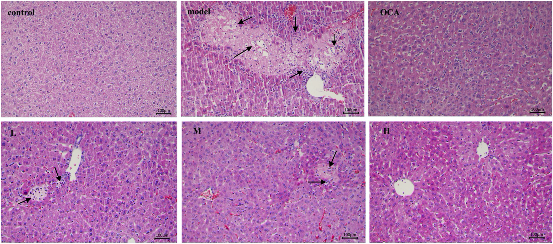 The effect of licraside intervention on the histopathology of liver in ANIT-induced in-trahepatic cholestasis mice (20 ×), control group (control), ANIT group (model), OCA group (OCA), low-, medium- and high-dose licraside groups (L, M, H).