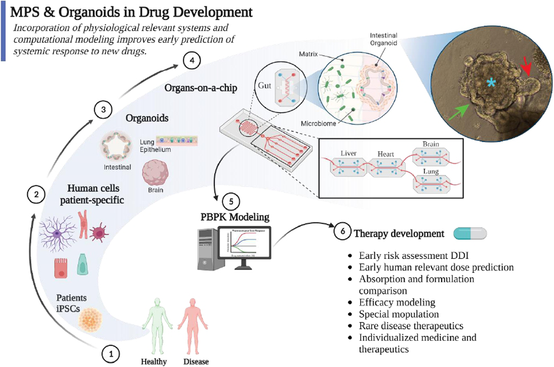 Generating human organoids from iPSCs mimics the stages of the organ developmental process. Hence, for organs with long maturation timeframe such as brain, protocols to generate of iPSCS derived organoids might take over 60 days, while for fast regenerating organs like the intestines it can take about 7–10 days. Figure 1 shows an example of iPSC derived intestinal organoid cultured for 6 days. These organoids recapitulate the cellular hierarchy in the intestines with crypts-like domains, villus regions, and central lumen. Recently different systems, including breast cancer (Liu et al., 2022), pancreatic (Seppala et al., 2022), and gastrointestinal organoids (Rodrigues et al., 2022) have been successfully used for drug screening, response prediction, and toxicity studies. Furthermore, comparing the results using organoids with clinical outcomes demonstrated the advantage that organoids offer to speed up the generation of data to guide treatment and dose selection (Seppala et al., 2022). Altogether, these organoids provide a promising model for drug efficacy and toxicity screening. MPS are in vitro platforms containing human or animal cells/tissues within a biomimetic microenvironment to yield physiologically relevant mechanical, biochemical, and electrical responses (Rothbauer et al., 2021). As discussed by Feuilloley’s research group from the University of Rouen Normandie (Zommiti et al., 2022), MPS have significantly advanced from the original academic-only environment. The business model of many rising companies revolves around the commercialization of MPS (Ribas et al., 2018). These MPS range from in vitro reductionist models of a specific functional unit of an organ (e.g., 3D model of lung epithelium (Huang et al., 2013) to more complex single and multiple interconnected organs-on-chips (8 connected -organs-on-chips (Novak et al., 2020). MPS have demonstrated significant value for the drug development industry. For instance, systems like human 3D models of healthy (Hoffmann et al., 2018) and cystic fibrosis respiratory track (Nickolaus et al., 2020) have been used to identify optimal drug and dose to treat patients. While the use of MPS is questioned because it is highly complex structure, it often offers very high sensitivity and specificity. For instance, recent paper reported human-liver-chip with 100% specificity and 87% sensitivity when predicting drug-induced liver injury (Ewart et al., 2022). Despite different views about MPS and organoids as competing systems, integrating both as complementary technology is gaining popularity. Hence, the combination of MPS and organoids is in its infancy and carries an exciting future to accelerate pharmaceutical drug development by improving the clinical translation of basic research (Figure 1).