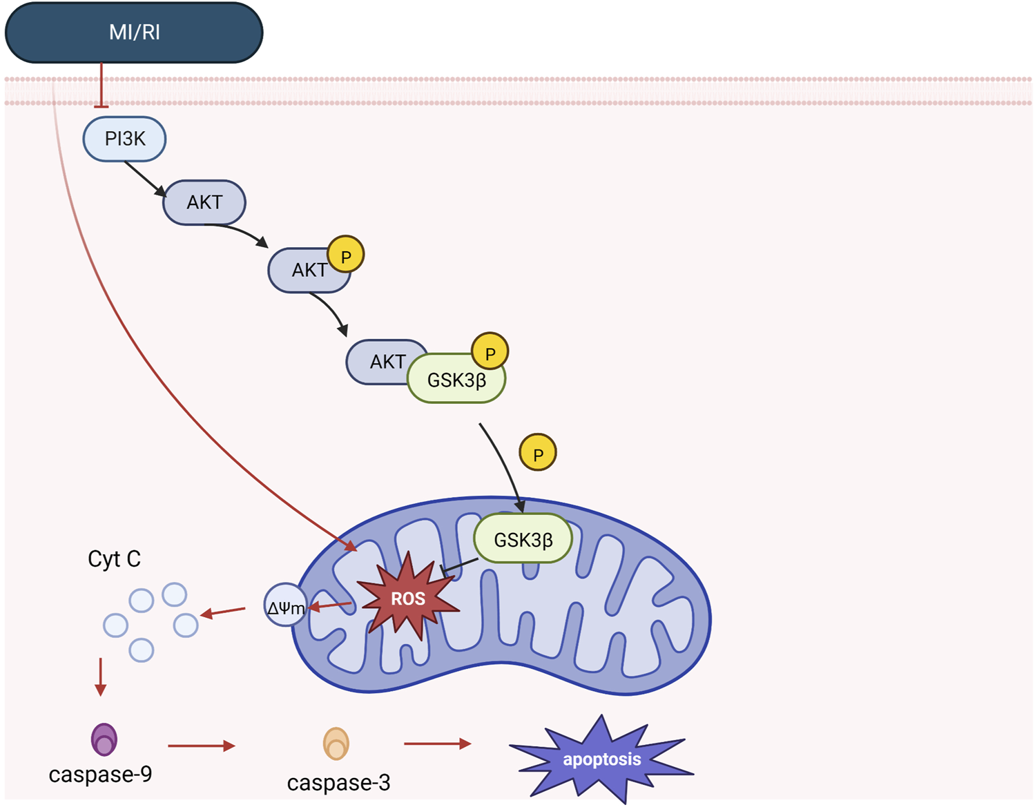 FIGURE 2. Mechanistic of PI3K signaling. Under physiology, mitochondrial integrity is maintained by PI3K/Akt signaling, and Akt phosphorylates GSK3β. However, in the case of MI/RI, PI3K/Akt signaling was inhibited, while MI/RI caused excessive ROS production in cell mitochondria, increased oxidative stress, altered mitochondrial membrane potential, released cyt c and caspase-9, promoted the formation of apoptotic vesicles, increased caspase-3 release, and promoted the apoptotic cascade response (see apoptosis mechanism diagram for details).