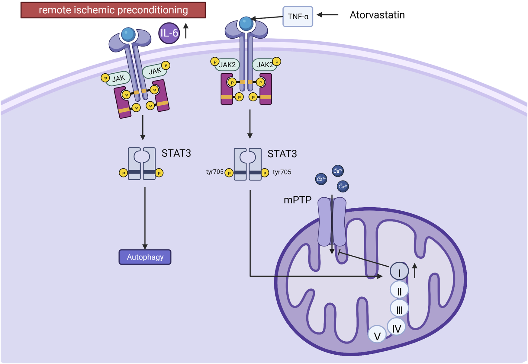 FIGURE 3. Mechanism of JAK/STAT signaling. Post-ischemic treatment increases STAT3 phosphorylation at tyrosine 705 (tyr 705), promotes mitochondrial complex I respiration, maintains mPTP sensitivity to opening, and inhibits mPTP storage capacity for calcium. Remote ischemic preconditioning increases plasma IL-6, regulates autophagy via the JAK/STAT3 pathway, and protects against MI/RI. Atorvastatin activates JAK2 and STAT3 via TNF-α.