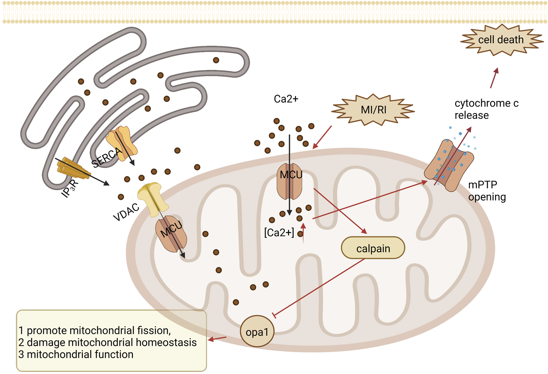 FIGURE 4. Mechanisms of calcium signaling. Under MI/RI, MCU causes mitochondrial Ca2+ overload, opening of the mPTP, and cell death. During myocardial reperfusion, MCU-induced mitochondrial calcium overload activates calpain, which inhibits optic atrophy type 1 (OPA1), thereby inhibiting mitochondrial fusion and mitochondrial autophagy and promoting mitochondrial division, leading to impaired mitochondrial morphology and function, resulting in cardiomyocyte apoptosis.