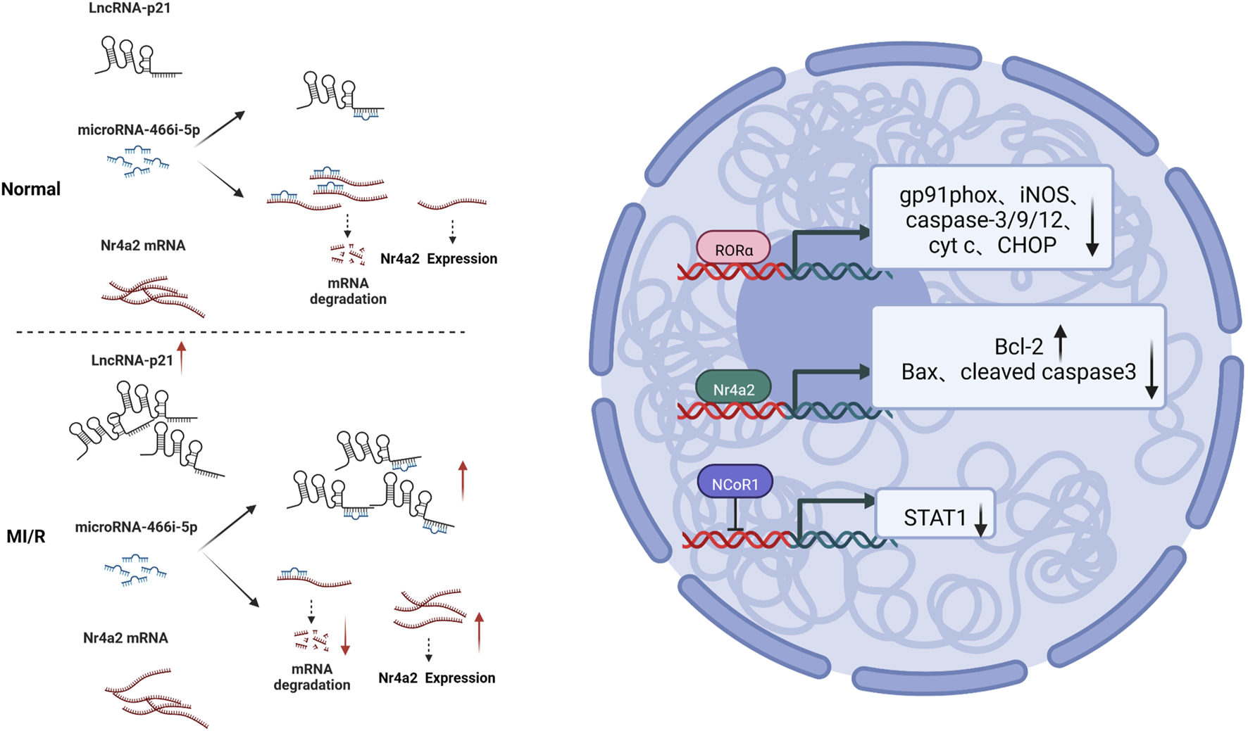 FIGURE 5. Mechanism of nuclear receptor signaling. MI/RI upregulated LnRNA-21, which caused more miRNA-466i-5p to bind competitively to it, resulting in less binding of Nr4a2 mRNA to miRNA-466i-5p and, relatively, more Nr4a2 mRNA expression, and increased Bcl-2 expression and downregulated Bax and cleaved caspase 3 expression; RORα inhibited expression of gp91phox, iNOS, caspase-3/9/12, cyt c and CHOP; NCoR1 inhibited STAT1 expression.