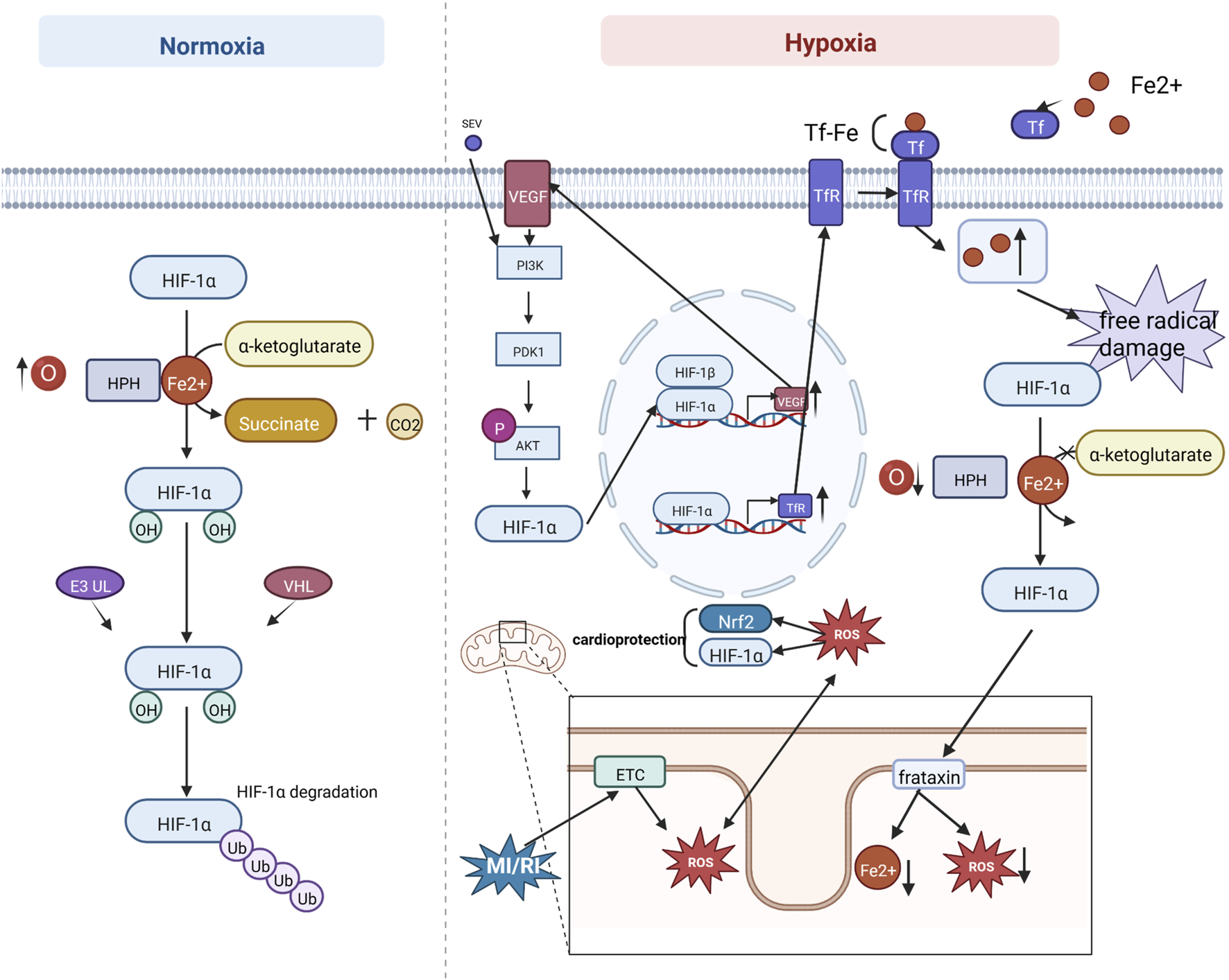 FIGURE 6. Mechanism of HIF-1 signaling. Under normoxic conditions, HIF-1α is degraded via the ubiquitin-protease pathway. During hypoxia, intracellular hypoxia inhibits HIF-1α activation by HIF-prolyl hydroxylases (HPHs), interacts with many coactivators, and regulates target gene expression. Sevoflurane (SEV) pretreatment can increase VEGF expression through the PI3K/AKT/HIF-1α signaling pathway. In addition, ROS produced by mitochondrial electron transport chain (ETC) can impair mitochondrial function to promote apoptosis, while stabilizing HIF-1α and the antioxidant transcription factor Nrf2 to protect cardiac function. HIF-1α activates upregulation of transferrin receptor (TfR) expression, which increases transferrin (Tf) binding iron uptake and increases intracellular iron levels, leading to iron catalytic free radical damage.