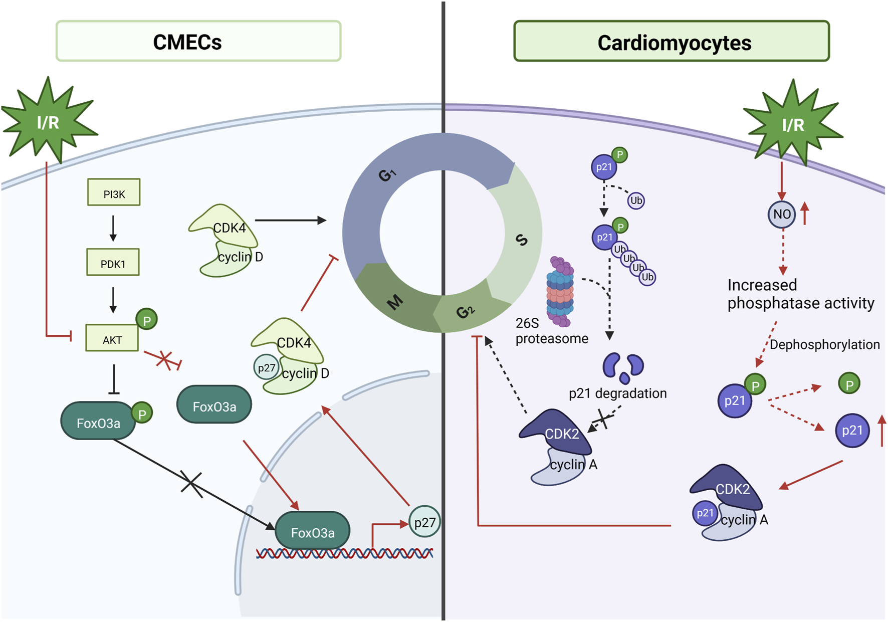 FIGURE 7. Mechanism of Cell cycle. Under MI/RI, cardiac microvascular endothelial cells (CMECs) are impaired, FoxO3a pathway is activated, AKT is inactivated, and AKT fails to inhibit FoxO3a, allowing FoxO3a to control the cell cycle by activating p27 Kip1 expression, inhibiting CDK4, and arresting cells in G1 phase. MI/RI induces NO production in cardiomyocytes, inhibits CDK2 activity through p21cip/waf1 accumulation to inhibit CDK2 activity and upregulate cyclin A/CDK2 activity thereby inhibiting apoptosis.