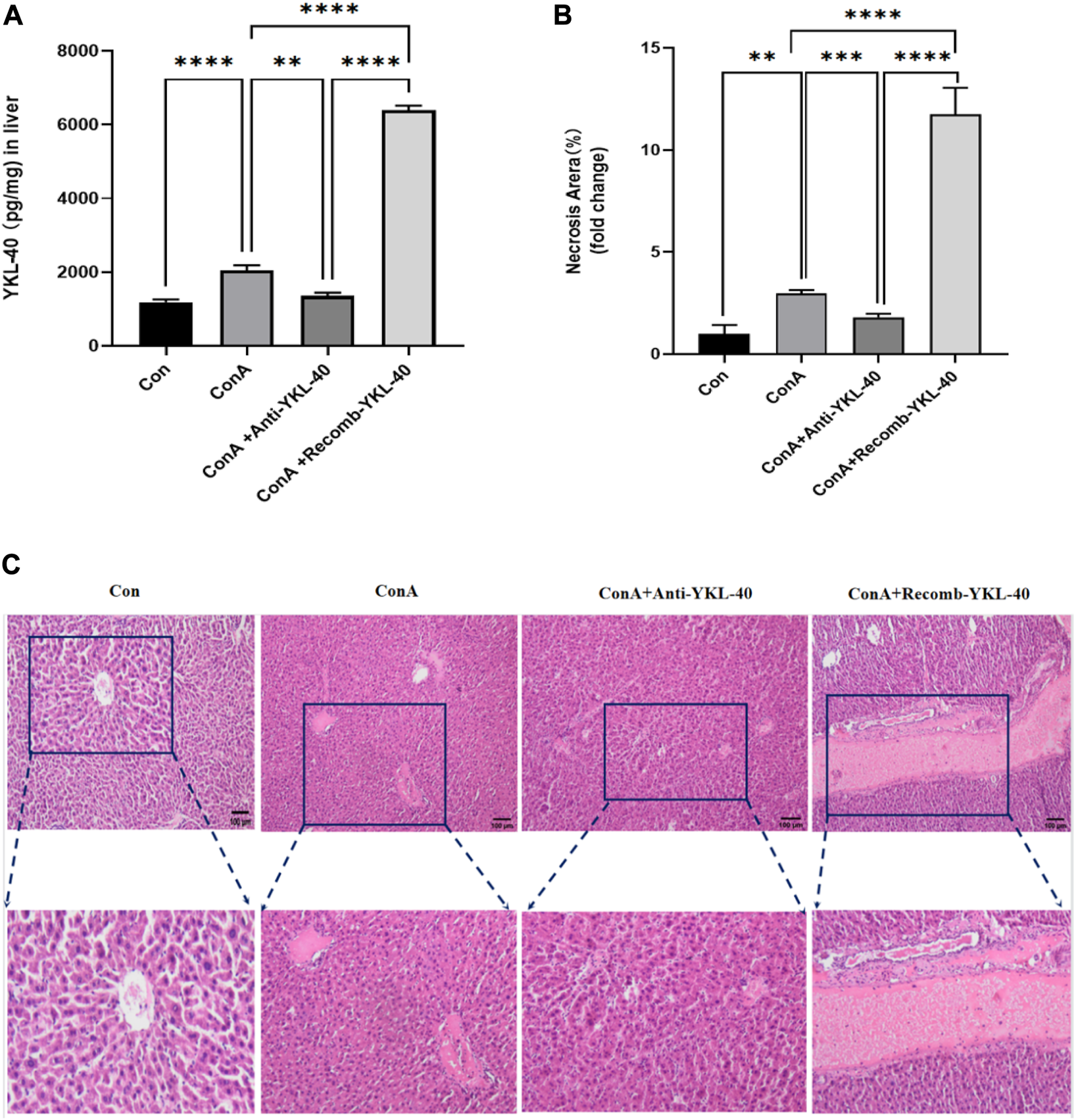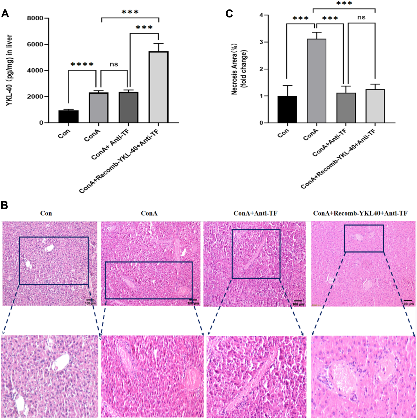 YKL-40 exacerbates the progression of liver injury.(A) The expression of YKL40 in liver tissue; (B) Hematoxylin and Eosin staining (magnification×100) showing YKL-40-mediated induction of TF-PAR1 pathway and aggravation of drug-induced liver injury. (C) Necrotic areas as quantified by ImageJ software. Data are expressed as mean ± SEM (n = 6). *p < 0.05, **p < 0.01, ***p < 0.001, ****p < 0.0001, ns means no statistical difference.