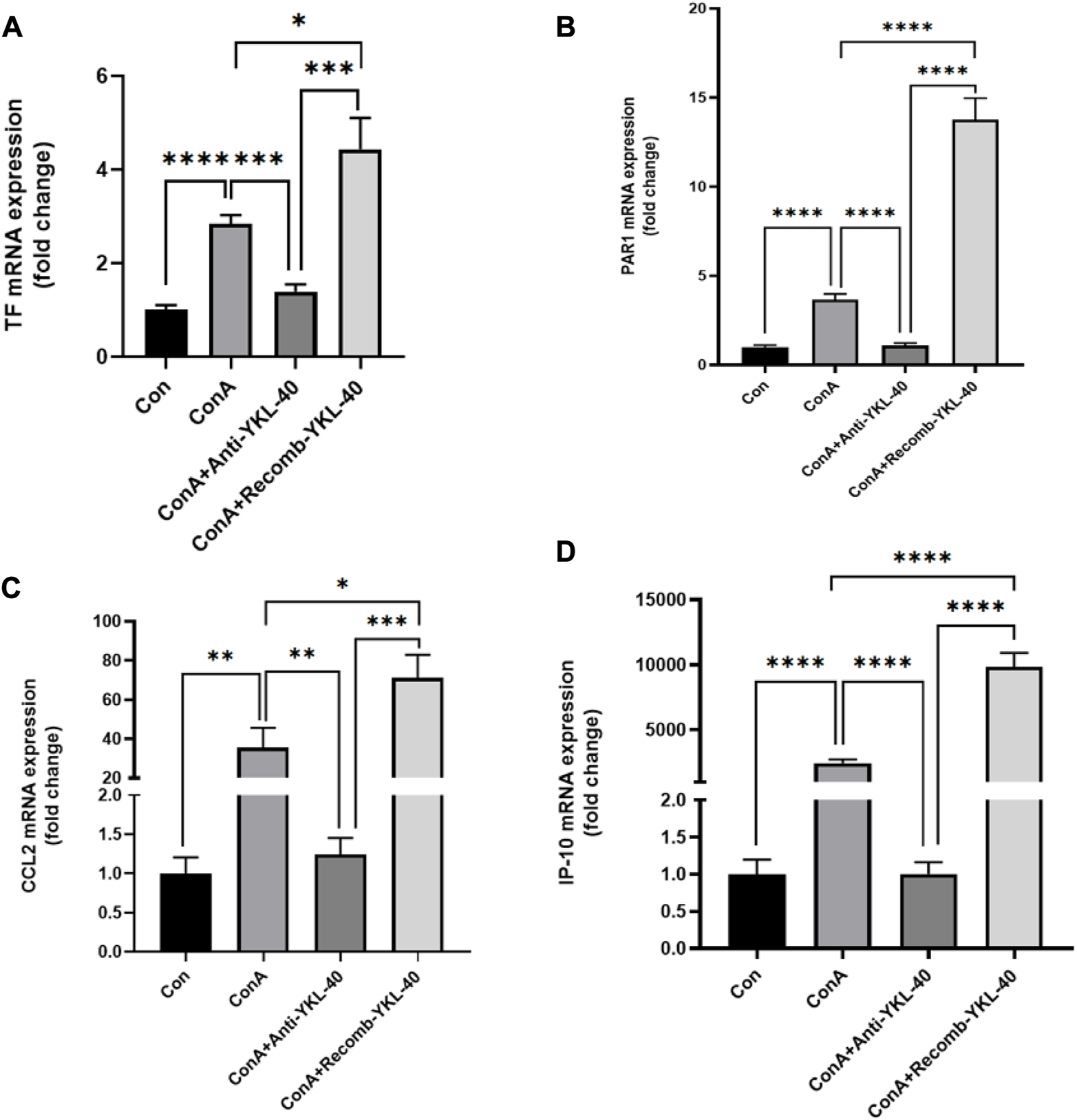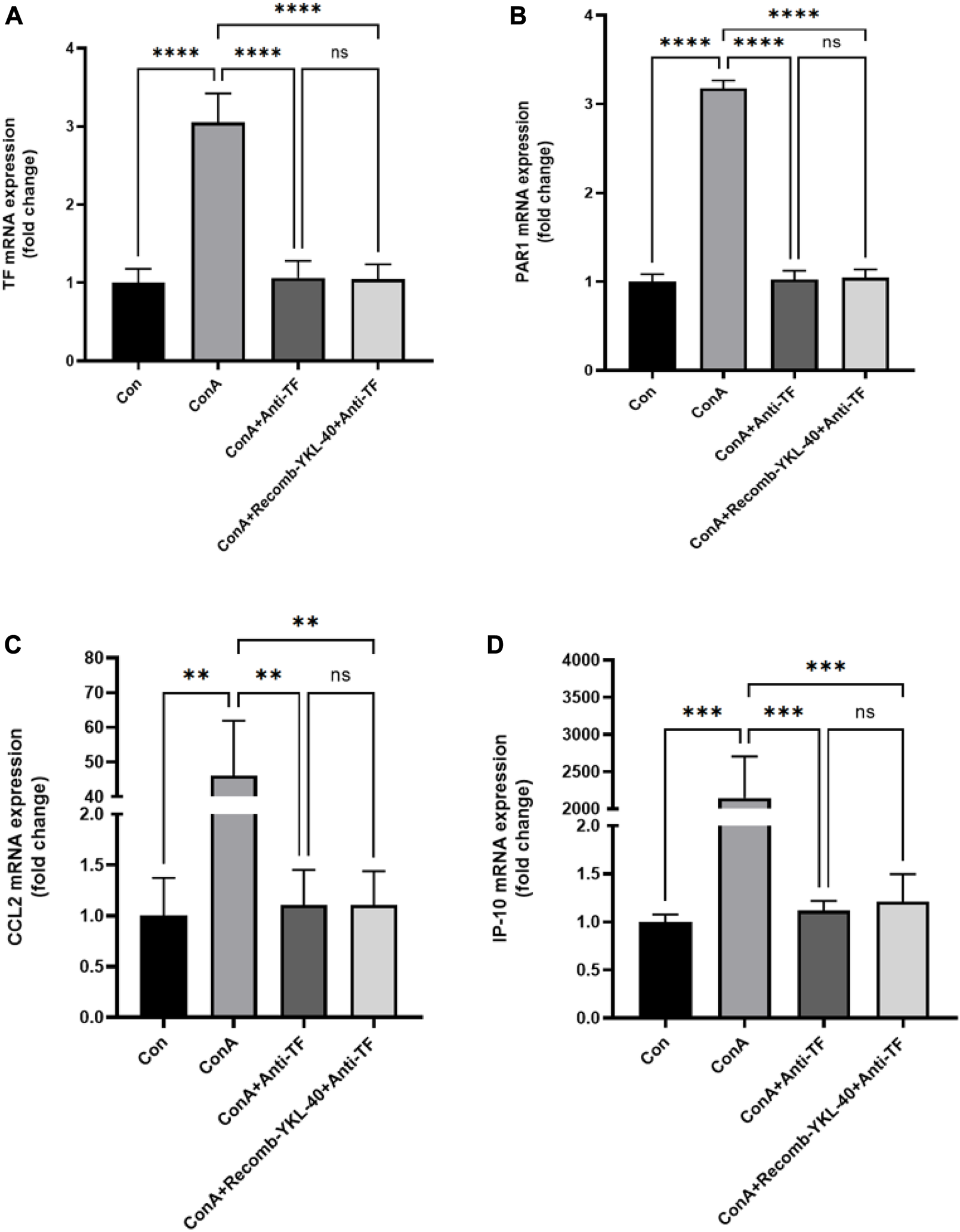 YKL-40 induces TF-PAR1 pathway, promoting the expression of chemokines CCL2 and IP10. (A) TF mRNA expression in mouse liver; (B) PAR1 mRNA expression in mouse liver; (C) CCL2 mRNA expression in mouse liver; (D) IP-10 mRNA expression in mouse liver. p values were determined using one-way ANOVA or an unpaired t-test. Data are expressed as mean ± SEM (n = 6). *p < 0.05, **p < 0.01, ***p < 0.001, ****p < 0.0001, ns means no statistical difference.