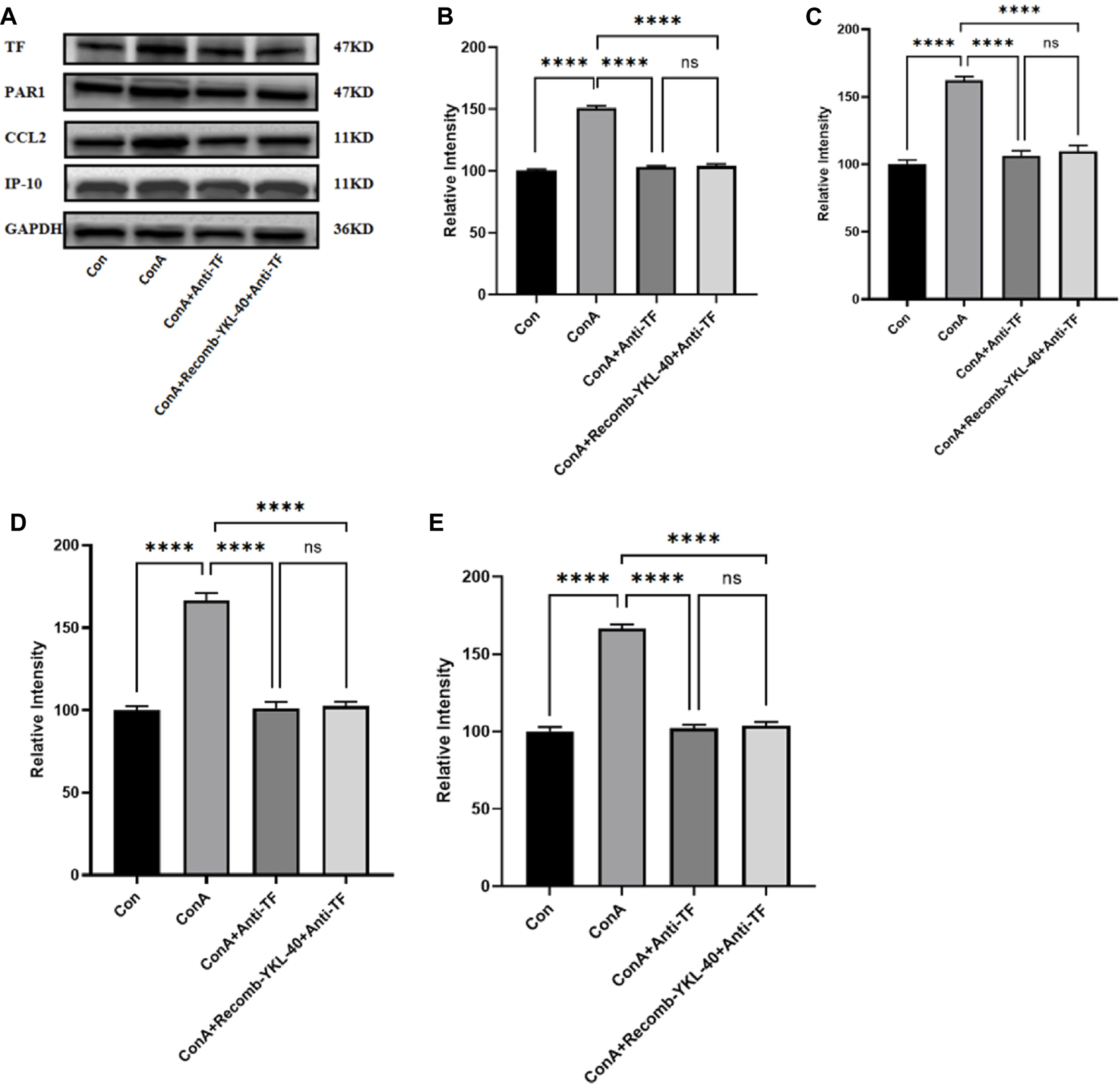 YKL-40 induces TF-PAR1 pathway and affects liver pathogenesis. (A) The levels of TF-PAR1 pathway proteins induced by YKL-40 in the liver and CCL2 and IP-10 were measured; (B) TF protein expression in mouse liver; (C) PAR1 protein expression in mouse liver; (D) CCL2 protein expression in mouse liver; (E) IP-10 protein expression in mouse liver. p values were determined using one-way ANOVA or an unpaired t-test. Data are expressed as mean ± SEM (n = 6). *p < 0.05, **p < 0.01, ***p < 0.001, ****p < 0.0001, ns means no statistical difference.