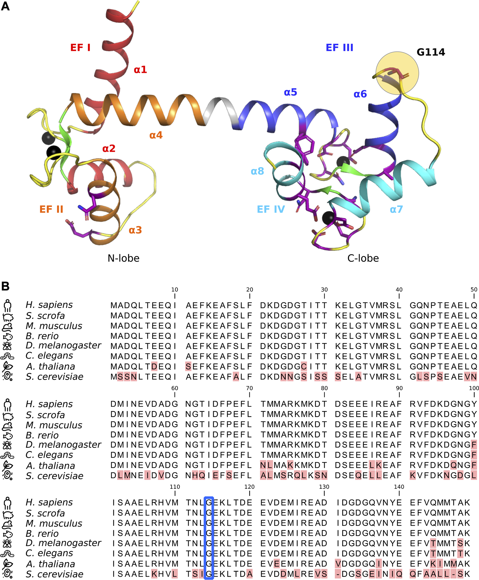 (A) Crystal structure of Ca2+-bound calmodulin (CaM) (PDB ID: 1CLL) with EF hands I (red), II (orange), III (blue), and IV (cyan) indicated along with their corresponding alpha-helices (α1-8). Beta-sheets are shown in green and flexible loops/unstructured regions in yellow. Amino acid residues known to harbor arrhythmogenic substitutions (Crotti et al., 2019) are shown in purple stick representation, with residue G114 highlighted with a yellow circle. Ca2+-ions are shown as black spheres. (B) CaM protein sequence alignment. Red highlights indicate amino acid differences or gaps in the alignment. Residue G114 is indicated by a blue frame. Numbering is according to immature human CaM (including the initial M).