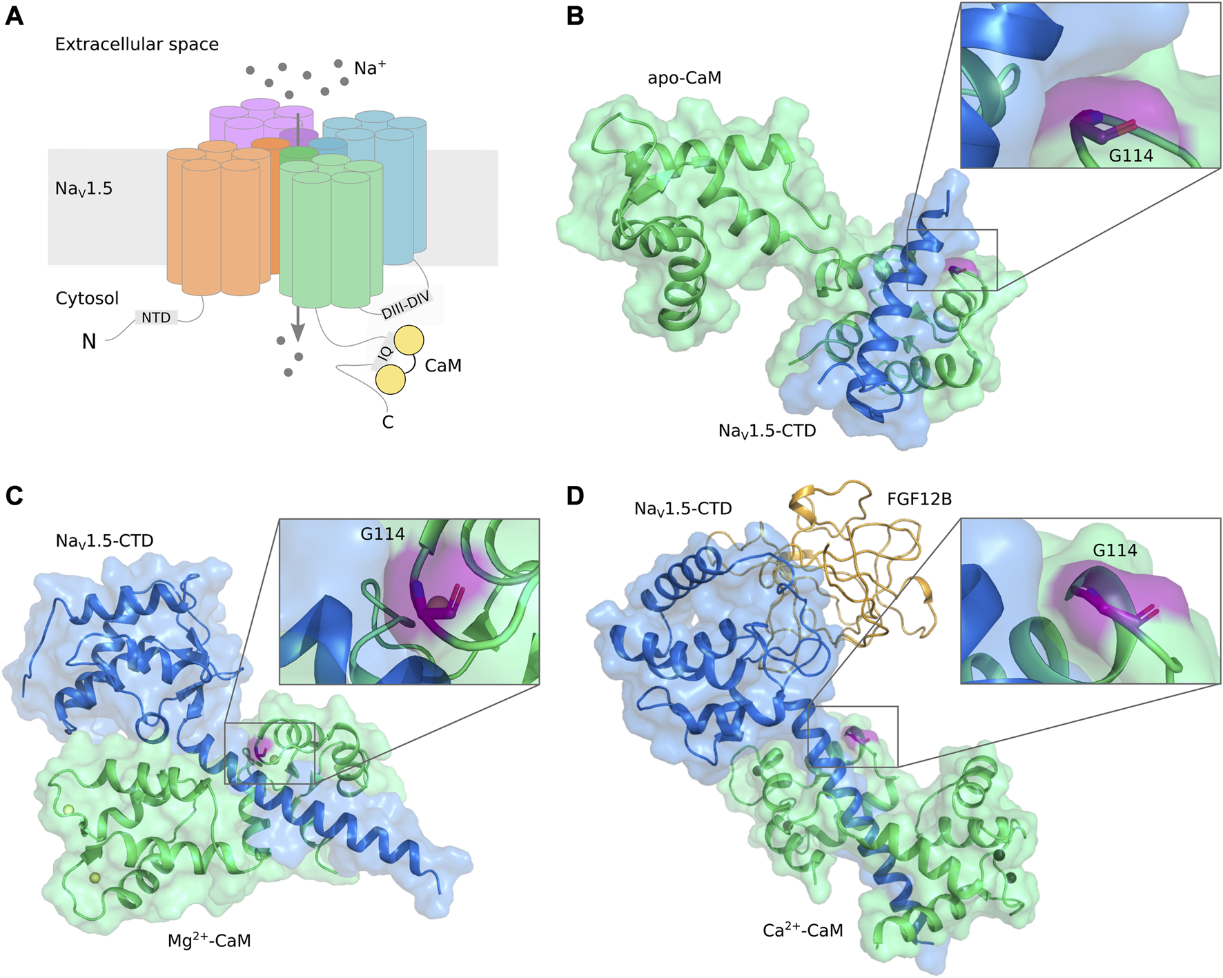 High resolution structures of CaM (green) in complex with the NaV1.5-CTD (blue) reveal that CaM-G114 (purple) is located at the interface between CaM and the channel (Figure 2). In the apo-form, only the C-lobe of CaM binds to the NaV1.5 IQ-domain (Figure 2B), whereas in the Mg2+- and Ca2+-bound forms, CaM wraps around the NaV1.5 CTD with both its lobes (Figure 2C, D). In all cases, the interaction brings CaM-G114 and the IQ-domain into close proximity (Figure 2, insets). We therefore hypothesized that substitution of residue G114 would affect the binding between CaM and the NaV1.5 channel.