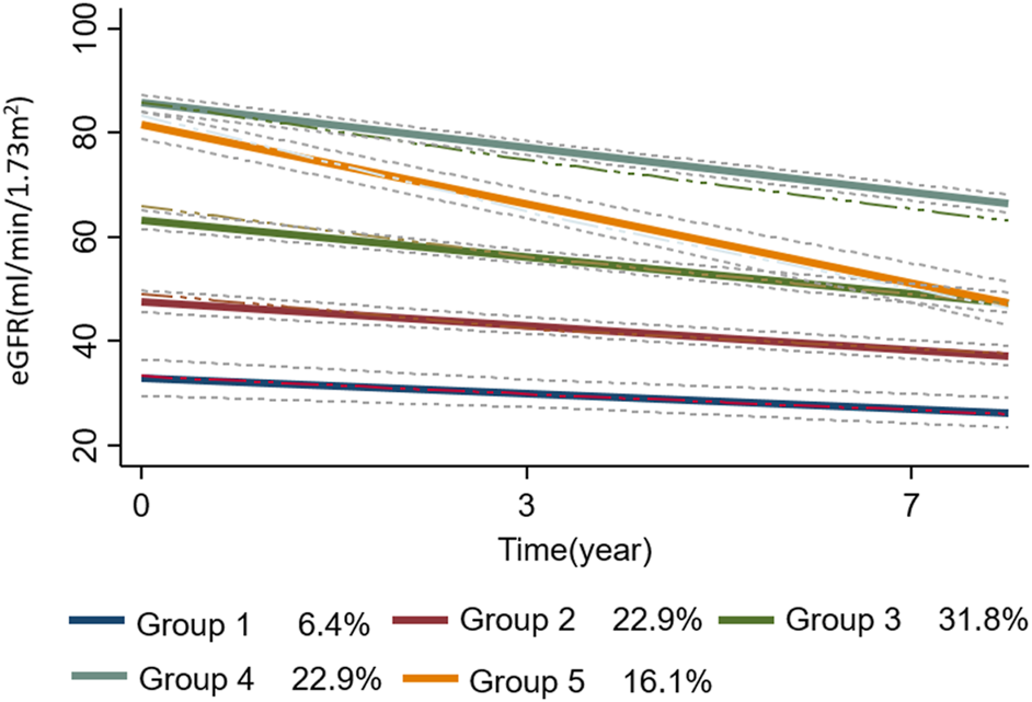FIGURE 1. the trajectories (n = 5) of eGFR evolution over time are plotted as a function of time. The dotted lines represent the 95% confidence intervals of each trajectory. In the bottom panel of the figure, the percentage of patients in each group-based trajectory is also reported. Abbreviation: eGFR, estimated glomerular filtration rate.