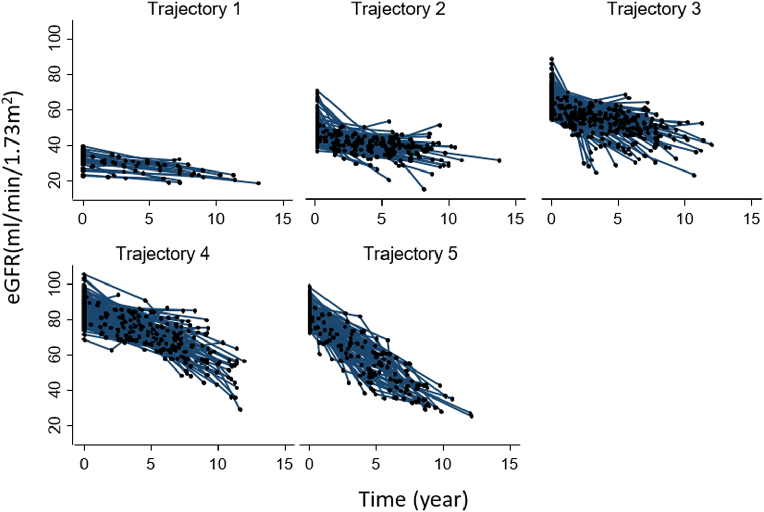 FIGURE 2. Individual evolution of eGFR over time in each group-based trajectory. Abbreviation: eGFR, estimated glomerular filtration rate.