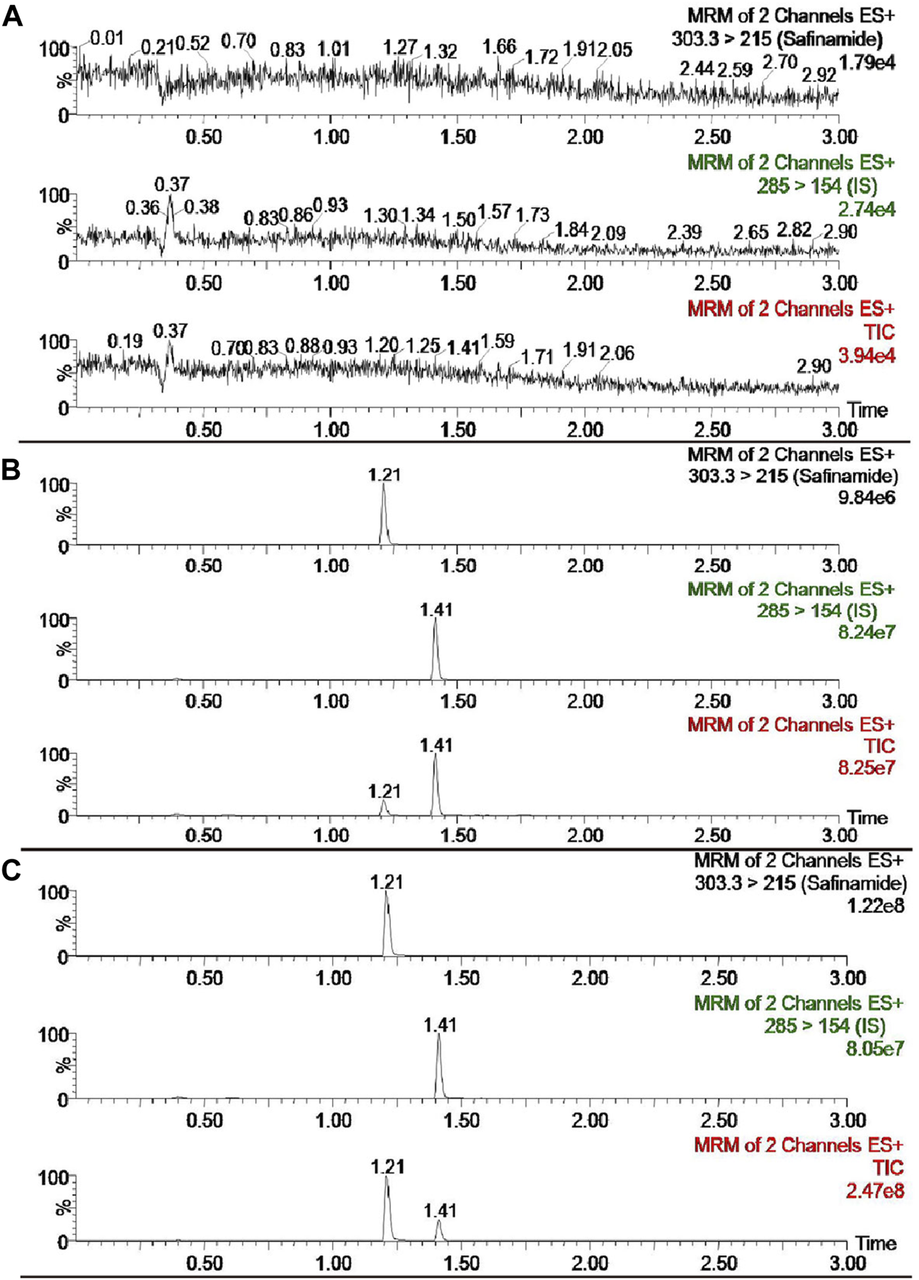 UPLC-MS/MS chromatograms of safinamide and diazepam (IS). (A) blank plasma sample; (B) blank plasma sample spiked with safinamide and IS. (C) real plasma sample from a rat after oral administration of safinamide.