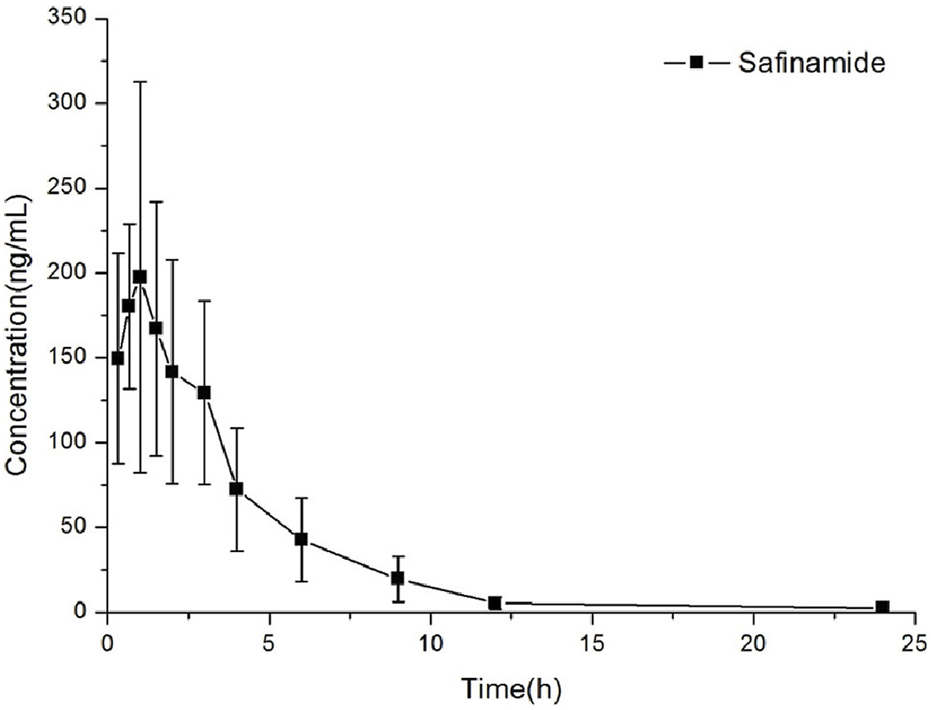 Eight male Sprague-Dawley rats (180–220 g) purchased from the Laboratory Animal Center of The First Affiliated Hospital of Wenzhou Medical University (Zhejiang, China) were used to study the pharmacokinetics of safinamide. All experimental procedures and protocols were operated under the National Institutes of Health Guide for the Care and Use of Laboratory Animals and were approved by the Animal Care and Use Committee of The First Affiliated Hospital of Wenzhou Medical University before the study began.