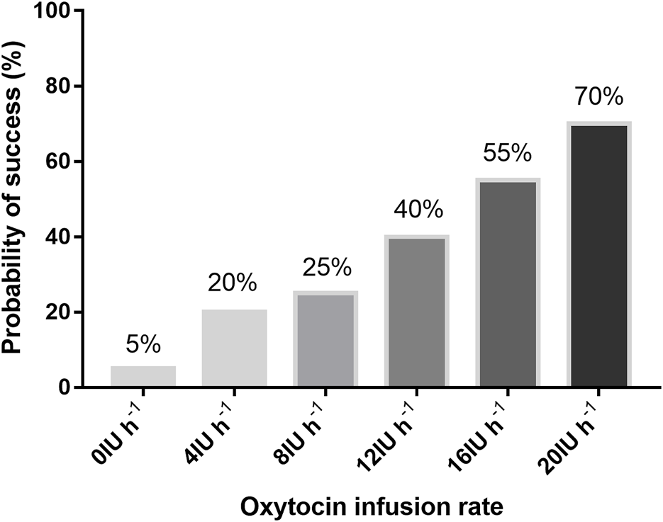 Oxytocin is linked to hemodynamic side effects ranging from myocardial ischemia, arrhythmias, vomiting, hypotension, chest pain, nausea, headache, to flushing. However, such side effects have connections with oxytocin doses and its administration rates (Jonsson et al., 2010). There was no statistical difference observed in the oxytocin-related adverse events among the different dose infusion groups. This may be attributed to the small dose difference of only 4 IU h−1 between the groups in this study. The oxytocin-related side effects were not aggravated and quickly alleviated after symptomatic treatment or after the end of oxytocin infusion.