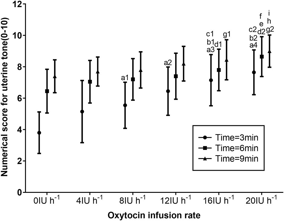 Numerical scores for UT according to the manual assessment by the obstetrician using a numerical scale of 0 (absent UT) to 10 (optimal UT) for groups receiving 0, 4, 8, 12, 16, and 20 IU h−1 oxytocin. Data are presented as mean ± standard deviation. a1p = 0.01, a2p = 0.001, a3p = 0.001, and a4p = 0.001 vs. 0 IU h−1 oxytocin group; b1p = 0.002 and b2p = 0.001 vs. 4 IU h−1 oxytocin group; and c1p = 0.026 and c2p = 0.001 vs. 8 IU h−1 oxytocin group at 3 min after oxytocin infusion. d1p = 0.031 and d2p = 0.001 vs. 0 IU h−1 oxytocin group; ep = 0.004 vs. 4 IU h−1 oxytocin group; and fp = 0.015 vs. 8 IU h−1 oxytocin group at 6 min after oxytocin infusion. g1p = 0.045 and g2p = 0.001 vs. 0 IU h−1 oxytocin group; hp = 0.004 vs. 4 IU h−1 oxytocin group; and ip = 0.001 vs. 8 IU h−1 oxytocin group at 9 min after oxytocin infusion.