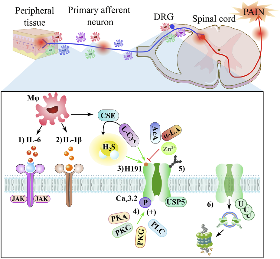 FIGURE 3. Neuropathic pain involves neuro-immune crosstalk. The peripheral nerve macrophages/spinal microglia (Mφ) accumulate after a nerve injury around nociceptors and DRG, inducing a variety of mediators, such as IL-6, IL-1β, and CSE enzyme. A close-up shows a schematic representation of some elements of the indirect regulation via Cav3.2 channels: 1) IL-6 (red) binds to sIL-6R (blue) and induces homodimerization of gp130 (purple) to activate the JAK signaling cascade that triggers upregulation of the Cav3.2 channel in DRG neurons; 2) the IL-1β (orange) binds to IL1R (brown), producing a second messenger pathway; 3) the reducing agents, such as L-cysteine (L-Cys) and H2S molecule, augment T-currents, while the oxidizing agents, such as ascorbic acid (AcA), α-Lipoic acid (α-LA), and Zn2+ ion, inhibit T-currents, both processes occur through the H191 residue; 4) the Cav3.2 channel can be phosphorylated through kinases, such as PKA, PKC, PKG, and PLC enzymes; 5) the Cav3.2 channel can be regulated through the glycosylation site; and 6) the expression of the Cav3.2 channel is regulated by USP5, a deubiquitinating enzyme that protects the channel from proteasomal degradation.