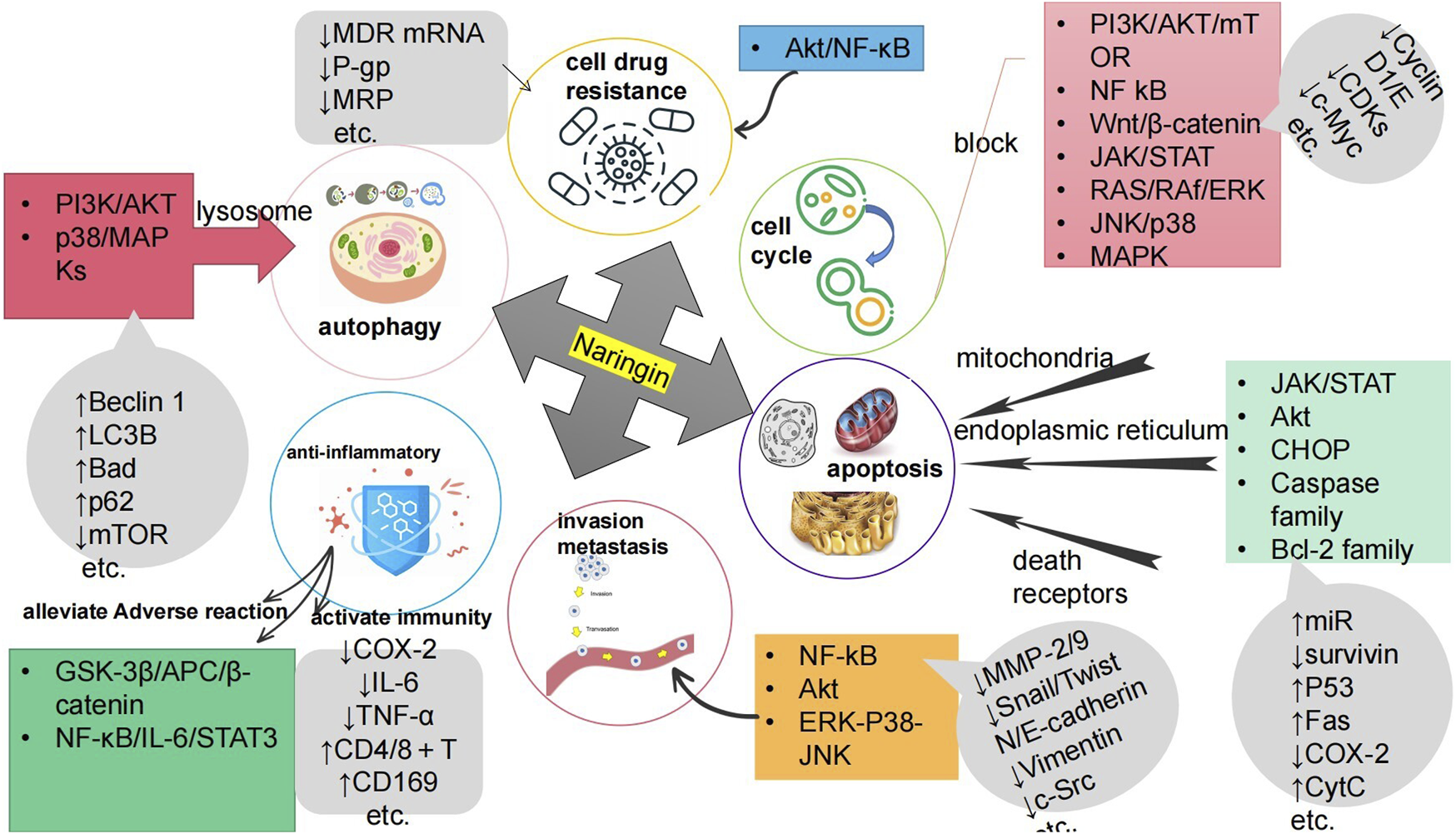 In summary, Naringin induced apoptosis in tumor cells mainly by regulating the Caspase family (Caspase-1, -3, -7, -8, -9, etc.) and Bcl-2 family (Bcl-2, Bcl-xL, Bax, Bad, etc.), and its mechanism of action was related to the regulation of 3 basic pathways (mitochondria, endoplasmic reticulum, death receptors), inhibition of JAK/STAT pathway, Akt related pathway, CHOP related pathway, regulation of microRNAs (miR-216a, miR-628-5p), and regulation of the expression of apoptosis-related factors and proteins (survivin, P53, Fas, COX-2, CytC, etc.).