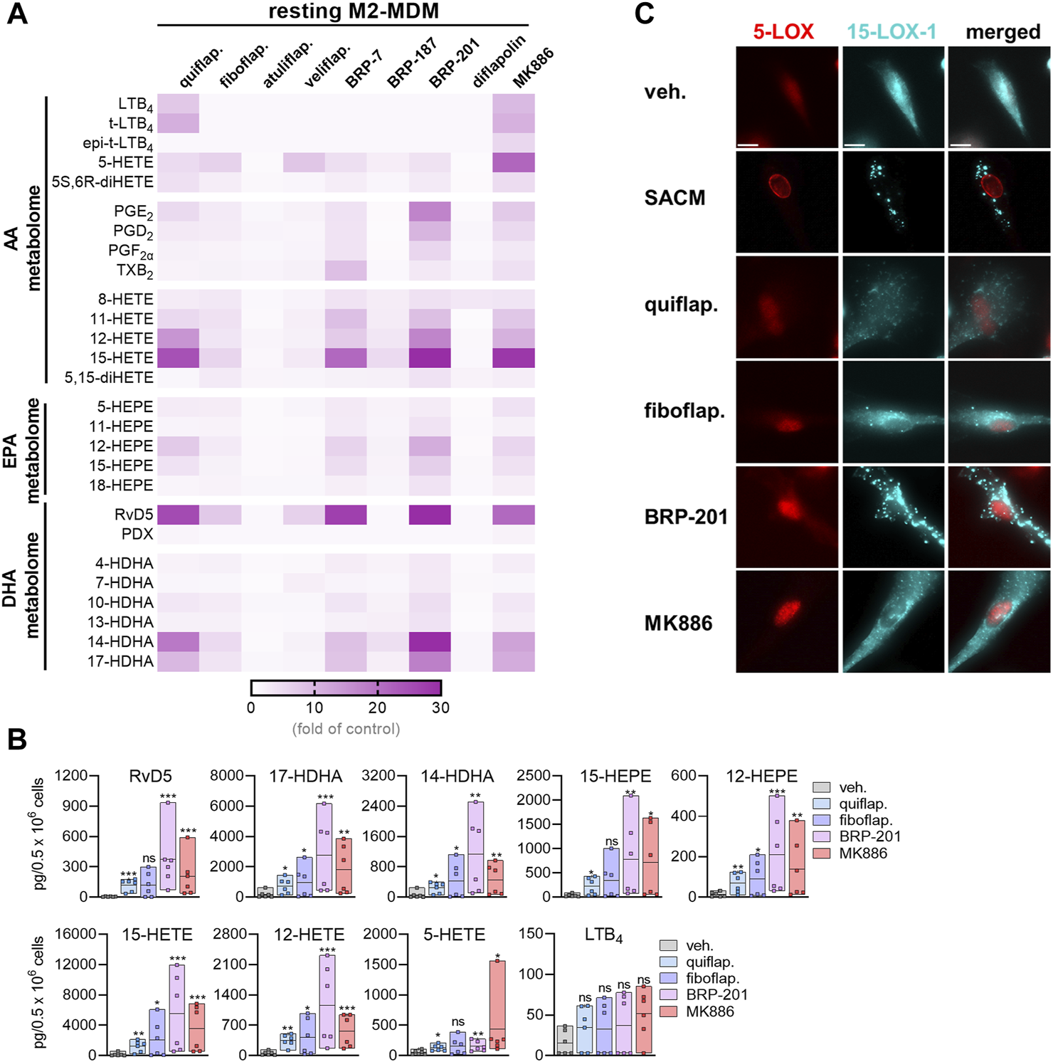 FIGURE 2. Induction of LM formation by FLAP antagonists in M2-MDMs. (A) Human M2-MDMs (0.5 × 106 cells) were incubated with FLAP antagonists: BRP-7 at 10 μM; quiflapon, fiboflapon, atuliflapon, and MK886 at 1 μM; and veliflapon, BRP-187, BRP-201, and diflapolin at 3 µM or with vehicle (DMSO, 0.1%) for 180 min at 37°C. Formed LMs were quantified in the supernatants by UPLC–MS-MS. (A) Results are given as a heatmap presenting the fold change to the vehicle control; n = 3. (B) Selected LMs produced in M2-MDMs upon stimulation with 1 µM quiflapon, fiboflapon, and MK886, 3 µM BRP-201, or with 0.1% vehicle for 180 min given as single values and as means in floating bar charts; n = 6 independent experiments. For statistical analysis, data were log-transformed and analyzed via matched one-way ANOVA with Dunnett’s multiple comparison test. *p < 0.05, **p < 0.01, and ***p < 0.001. (C) M2-MDMs were incubated with 1% SACM, 1 µM quiflapon, 1 µM fiboflapon, 3 µM BRP-201, or with vehicle (DMSO, 0.1%), and the incubation was stopped after 90 min at 37°C. Cells were fixed, permeabilized, incubated with antibodies against 5-LOX (red) and 15-LOX-1 (cyan blue), and analyzed by immunofluorescence microscopy; scale bar = 10 µm. Results, shown for a single cell, are representative for approximately 100 individual cells analyzed in n = 3 independent experiments.