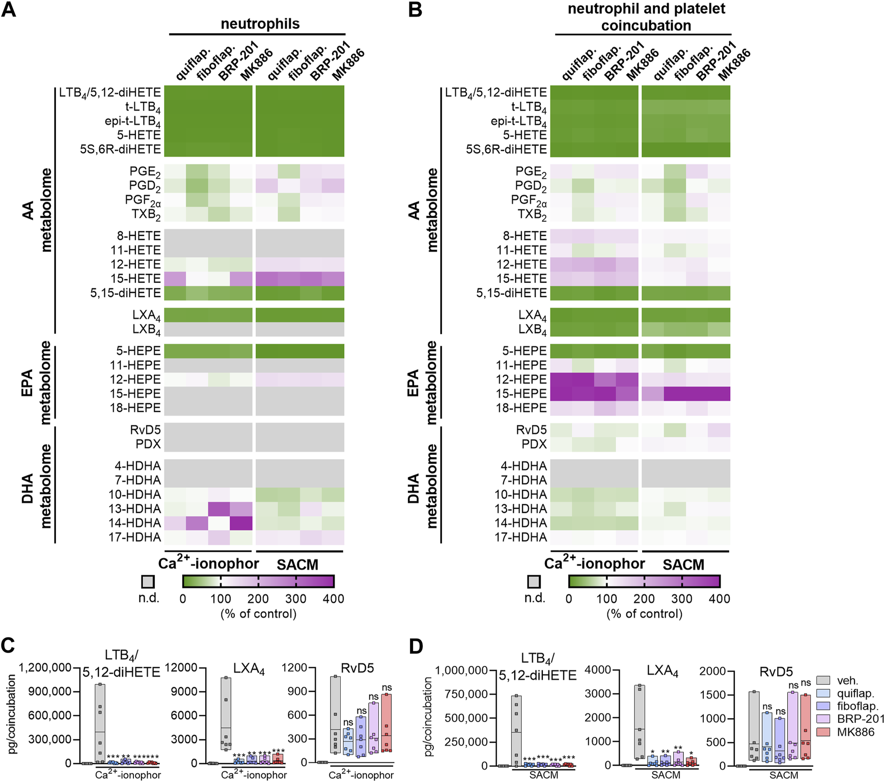 FIGURE 3. FLAP antagonists differentially modulate agonist-induced LOX product formation in stimulated neutrophil–platelet coincubations. Isolated neutrophils (1 × 107 cells/mL) or coincubations of neutrophils and platelets (1 × 107 and 25 × 107 cells/mL, respectively) were incubated in PBS pH 7.4 containing 1 mM Ca2+ in the presence or absence of FLAP antagonists for 15 min. Then, SACM (1%) or Ca2+-ionophore A23187 (2.5 µM) was added, and incubation was continued for another 90 min or 15 min, respectively. (A) Results of stimulated neutrophils are given as a heatmap presenting the fold change to the vehicle control; n = 7. (B) Results of stimulated neutrophil–platelet coincubations are given as a heatmap presenting the fold change to the vehicle control; n = 7. (C,D) Results for selected LMs are shown as pg LM per coincubation as single values and as means in floating bar charts for (C) Ca2+-ionophore A23187-stimulated coincubations or (D) SACM-stimulated coincubations, n = 7. For statistical analysis, data were log-transformed and analyzed via matched one-way ANOVA with Dunnett’s multiple comparison test; *p < 0.05, **p < 0.01, and ***p < 0.001; n.d., not detected.