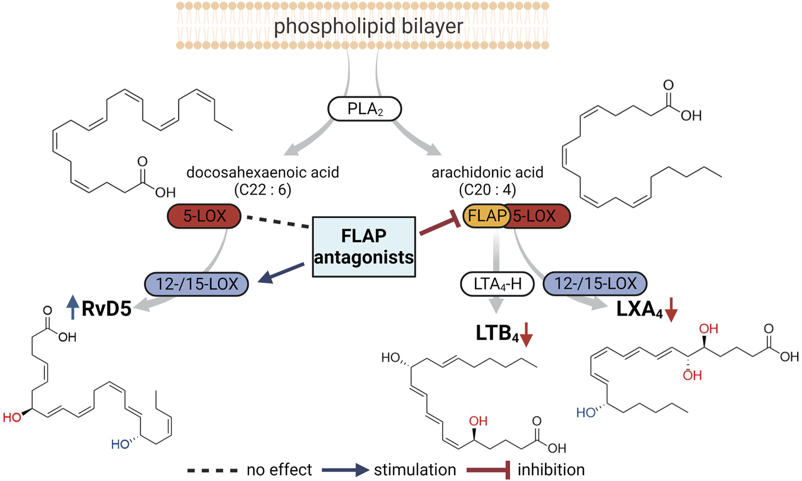 FIGURE 4. Overview of the proposed impact of FLAP antagonists on cellular LM networks. PLA2 enzymes liberate arachidonic acid (AA) and docosahexaenoic acid (DHA) as substrates for LOXs to produce LTB4 and LXA4 from AA and RvD5 from DHA. Formation of LTB4 and LXA4, involving 5-LOX, requires FLAP and, thus, is blocked by FLAP antagonists. RvD5 production by 5-LOX and 15-LOX occurs in the absence of FLAP, where some FLAP antagonists may even stimulate RvD5 formation.