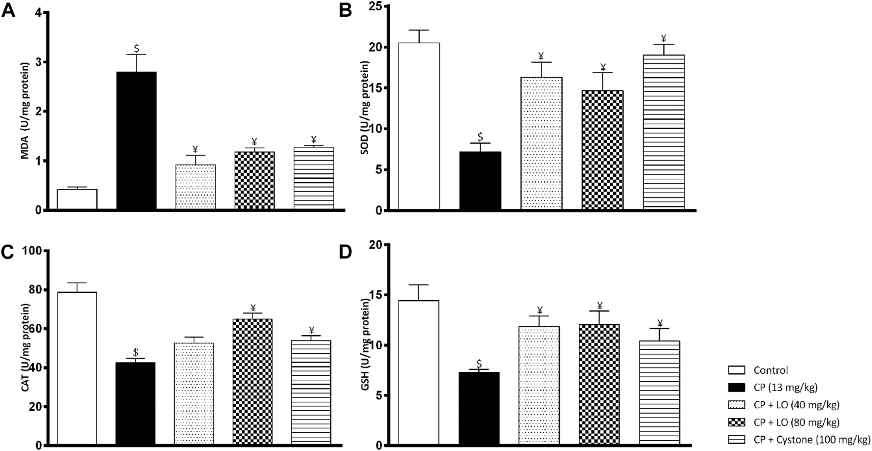 Leonotis ocymifolia (LO) modulates renal oxidative stress. Bar charts demonstrating renal lipid peroxidation product (malondialdehyde, MDA) level (A), superoxide dismutase (SOD) content (B), renal catalase (CAT) level (C) and renal reduced glutathione (GSH) content (D) following 30 days pretreatment with Leonotis ocymifolia (LO, 40 and 80 mg/kg, PO) and cystone as reference drug (100 mg/kg) followed by single dose cisplatin (CP, 13 mg/kg, IP). $,¥p < 0.05, vs. control, and cisplatin, respectively.
