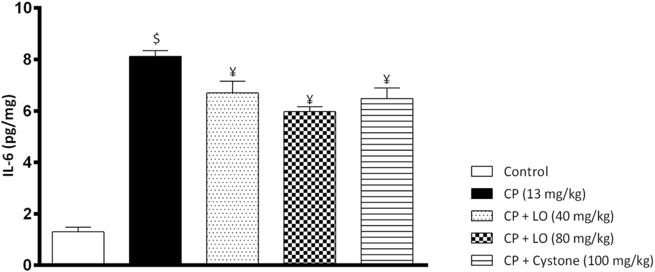 To investigate the effect of LO extract on renal inflammation, we measured one of the most important pro-inflammatory cytokines, IL-6. In the current study, cisplatin induced a significant increase in renal IL-6 compared to control group (Figure 5). Further, the present study found that LO extract dose dependently reduced renal IL-6 and exerted comparable or even better effects than cystone (Figure 5).