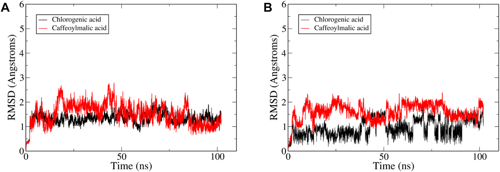 The reliability of the obtained docked poses was evaluated by running a 100 ns MD simulation for IL-6 with each one of these four compounds using AMBER software package (Case et al., 2021). Visual inspection of the resultant trajectories showed 2-O-caffeoylglucaric acid and rosmarinic acid completely detached from their initial binding site and so were not further considered in this study. On the other hand, the two compounds, caffeoylmalic and chlorogenic acids showed a relatively similar binding mode that was stable throughout the entire simulation. The convergence of the simulation was observed after 25 ns where the root mean square deviation (RMSD) of the backbone atoms of IL-6 levelled off at around 2 Å (Figure 6). For chlorogenic and caffeoylmalic acid, their RMSD showed some fluctuations before stabilizing at about 1.5 and 2 Å, respectively confirming the resultant binding modes of the docked poses.