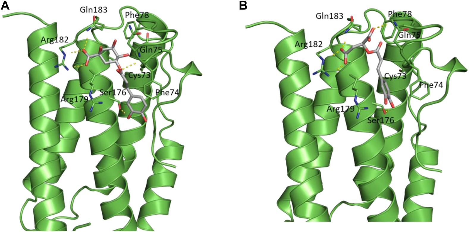 The docked poses of the two compounds showed their caffeic acid fragments binding in a similar manner (Figure 7) with the phenyl ring forming aromatic interactions with the side chain of Phe74 and one of the polar hydroxyl groups forming H-bond with the side chain of Ser176. The malic acid fragment of caffeoylmalic acid showed one of its acidic carboxyl groups forming bidentate ionic interaction with Arg182 and a H-bond with the side chain of Gln183 while the other carboxyl group is involved in H-bond with Gln75. For chlorogenic acid, the acidic carboxyl group of the quinic acid moiety showed strong interactions with Arg182, Arg179 and Gln183 in a similar fashion to the malic acid fragment of caffeoylmalic acid. In accordance, H-bond analysis showed the two compounds maintaining these similar H-bond interactions throughout the simulation (Table 3).