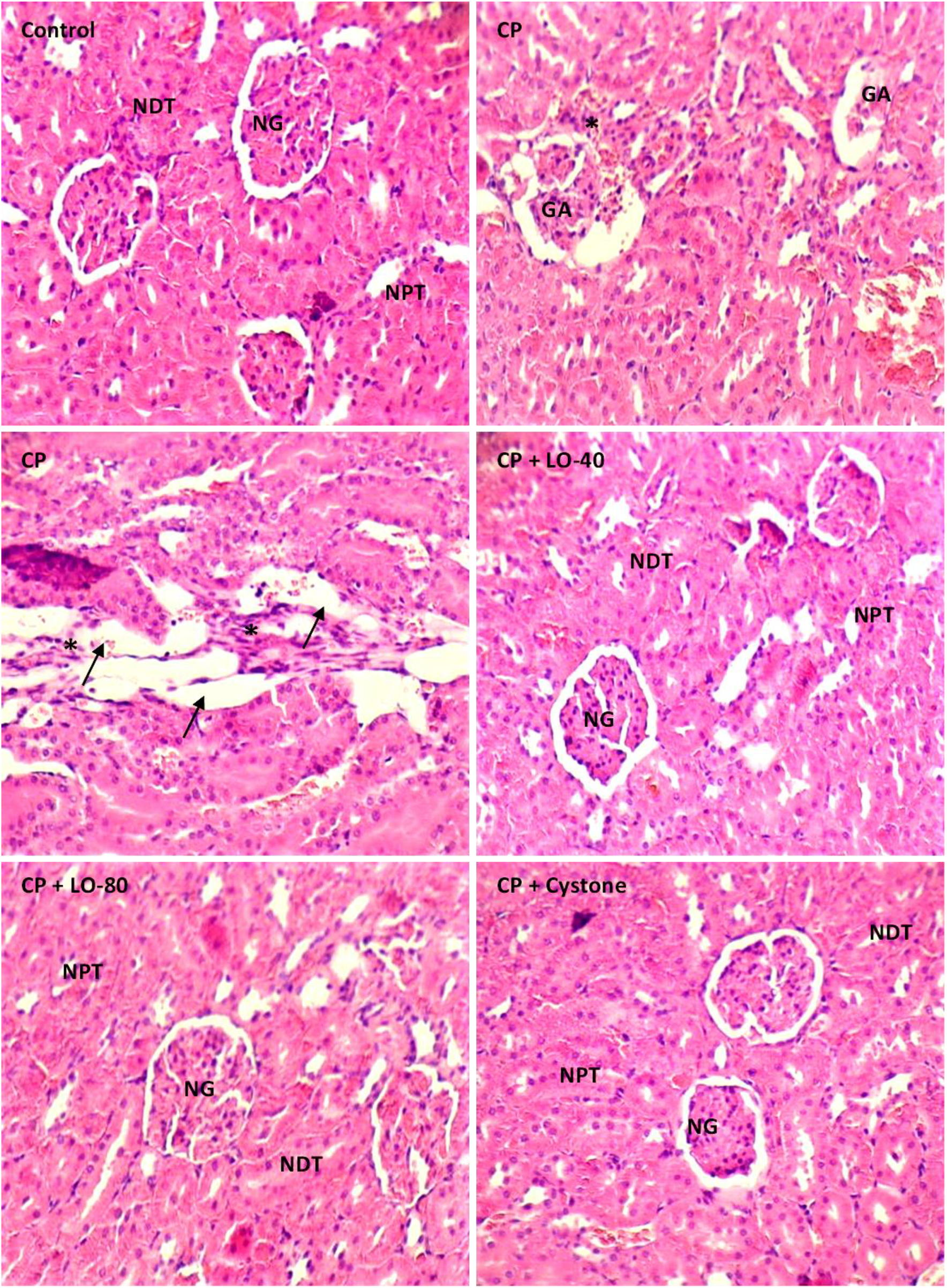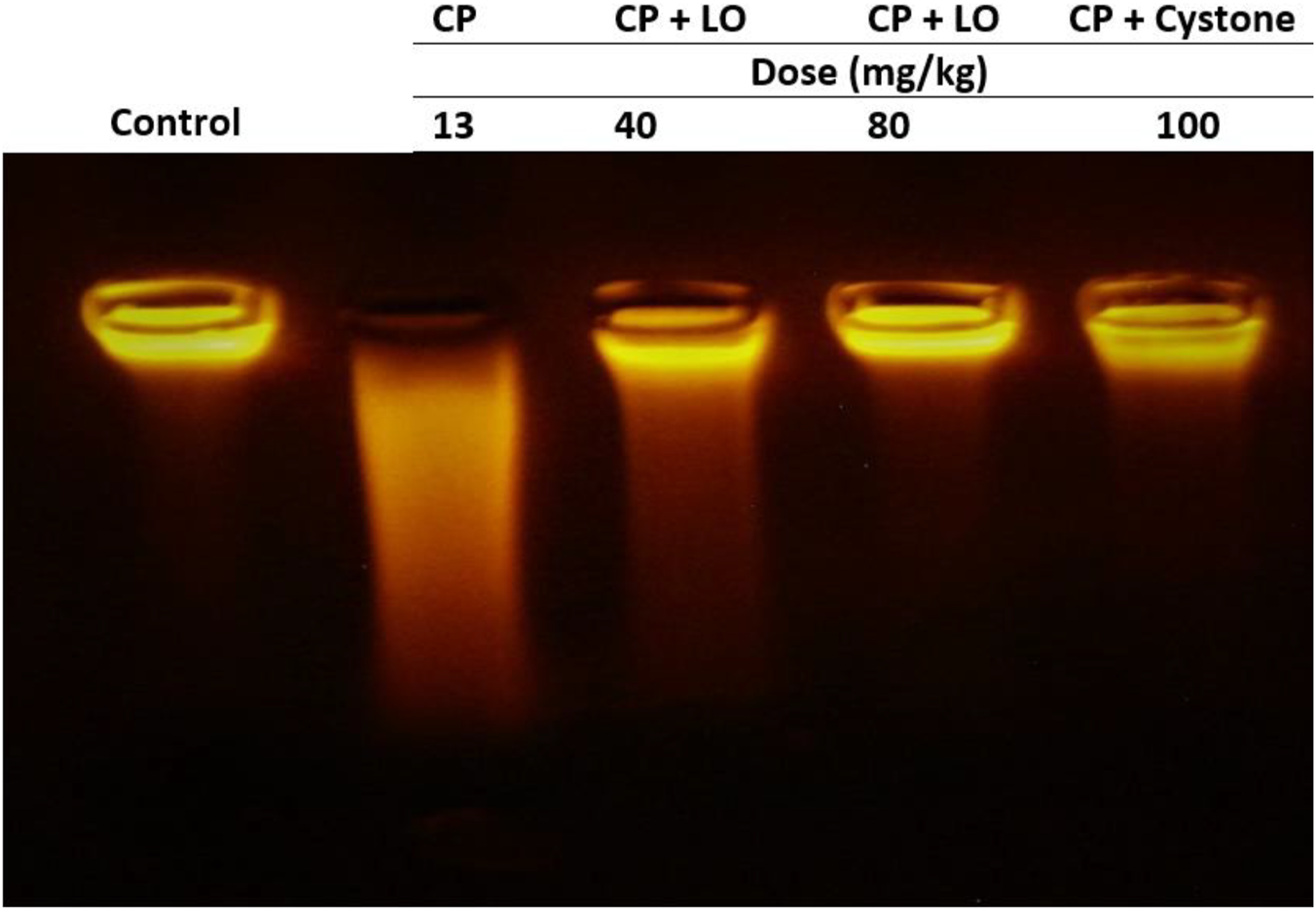 Cisplatin was dissolved in saline and injected to animals intraperitoneally at the dose of 13 mg/kg body weight (b.w.) to induce nephrotoxicity as per previous studies (Domitrović et al., 2013). Forty animals were divided into 5 groups (n = 8). One of the groups was regarded as control and received oral treatment with vehicle control (saline) while the remaining four groups received cisplatin (CP, 13 mg/kg b. w.), a single dose (IP) on day 30. Among these groups, two were selected and given an oral treatment with LO extract (40 mg/kg b. w.) and (80 mg/kg b. w.) respectively for 30 days while one group received an oral treatment with the reference drug, cystone (100 mg/kg b. w.) for 30 days. The last group of cisplatin induced animals was left untreated.