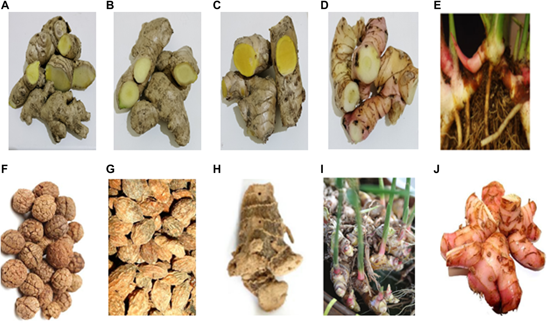 FIGURE 2. Rhizomes, seed, or kernels: (A) Z. zerumbet, (B) Z. officinale, (C) Z. cassumunar, (D) Z. cassumunar, (E) A. conchigera, (F) A. katsumadai, (G) A. oxyphylla, (H) A. officinarum, (I) A. zerumbet, and (J) A. purpurata.