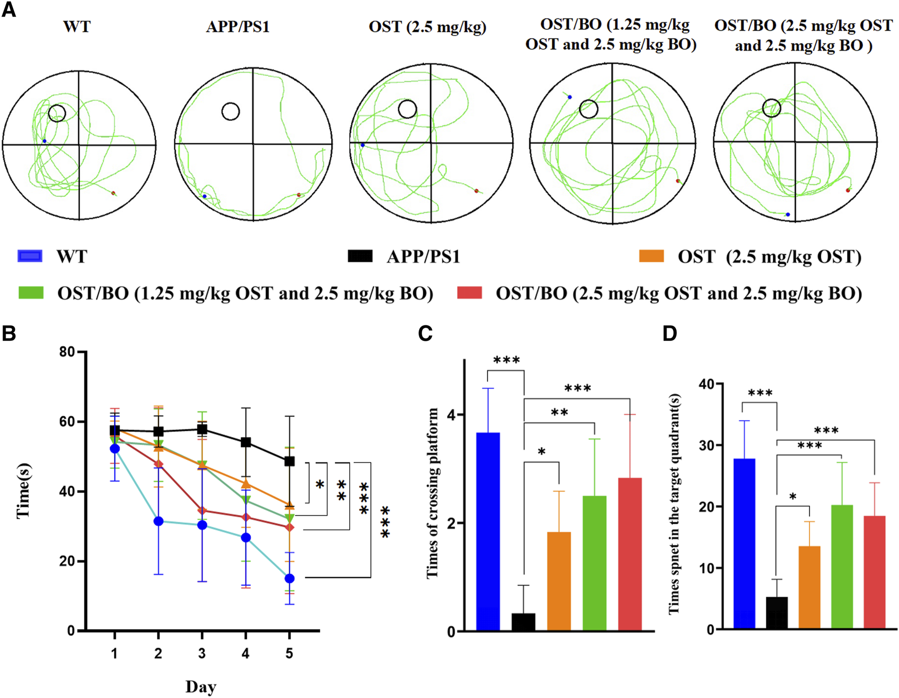 For the further pharmacological study of OST/BO gel with intranasal administration, C57BL/6J 7-month-old mice were set as the WT group, and 7-month-old APP/PS1 transgenic mice were randomly divided into four groups with two doses of OST treatment—Group Ⅰ: APP/PS1 (gel matrix), Group Ⅱ: OST (2.5 mg/kg in gel), Group Ⅲ: OST/BO (1.25 mg/kg OST and 2.5 mg/kg BO, in gel), and Group Ⅳ: OST/BO (2.5 mg/kg for each, in gel). The animals were intranasally administered with OST and OST/BO gel (n = 6). After 6 weeks of continuous intranasal treatment, the mice’s behavioral tests were conducted, including open field, novel objective recognition, Y-maze, and Morris water maze tests.