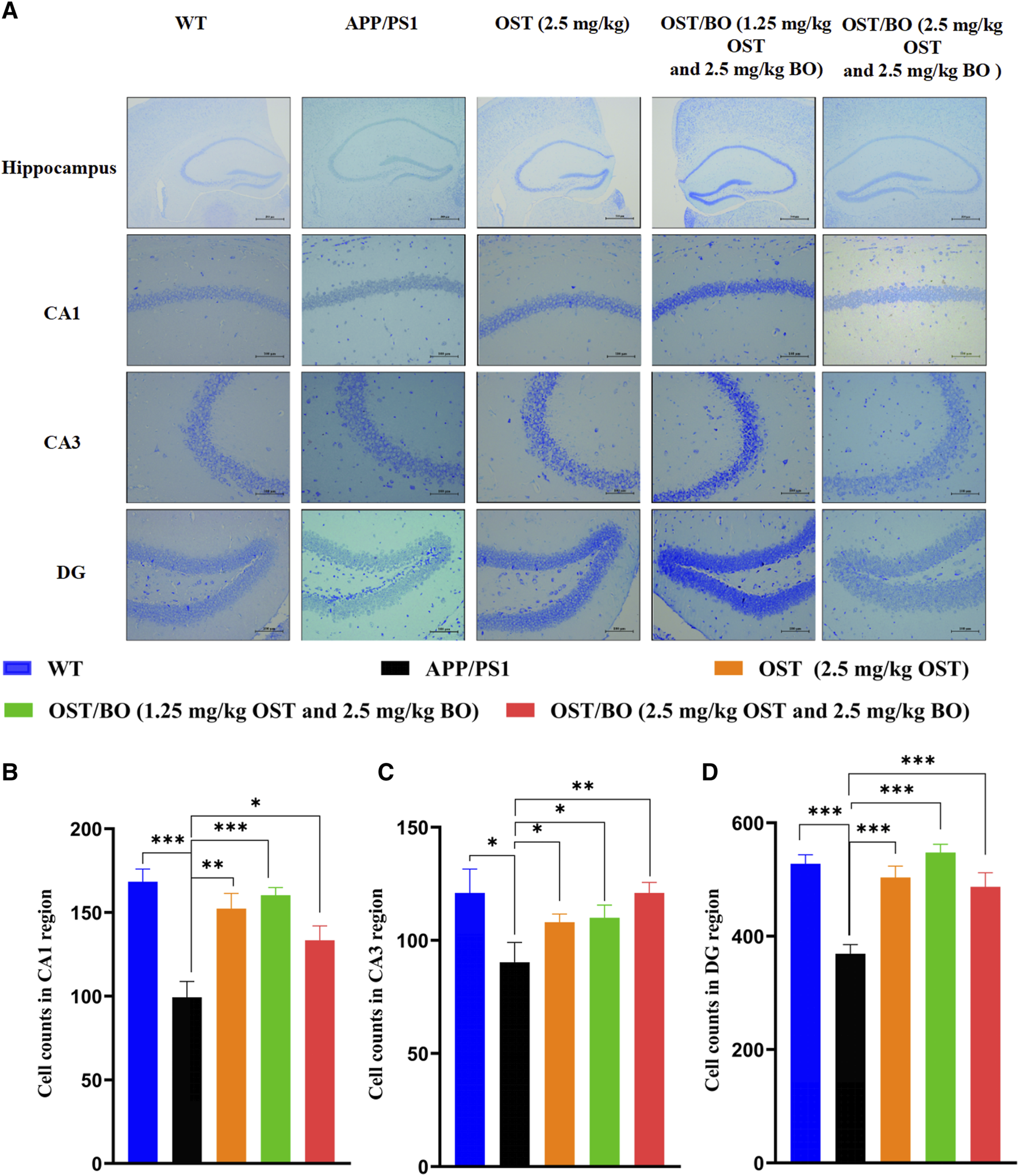 From the Nissl staining results, the number of intact neurons of the APP/PS1 group compared with the WT group reduced in the regions of CA1 (p < 0.001), CA3 (p < 0.05), and DG (p < 0.001) (Figure 6A). As expected, the number of intact neurons significantly increased under intranasally treated OST/BO gel. Specifically, the neurons in CA1 increased 50% (p < 0.01), 55% (p < 0.001), and 45% (p < 0.05) after intranasal treatment with OST (2.5 mg/kg in gel), lower OST/BO (1.25 mg/kg in gel), and OST/BO (2.5 mg/kg) (Figure 6B). The same results were observed in the regions of CA3 and DG (Figures 6C, D).