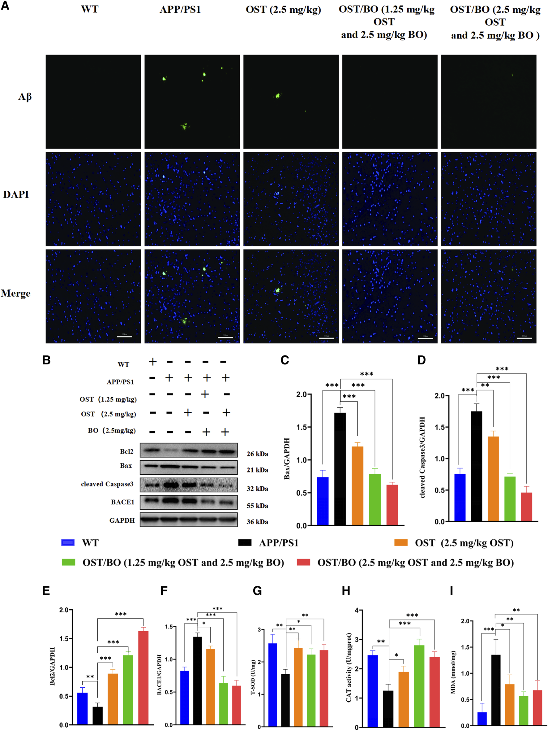 Th-S staining showed that amyloid plaques overexpressed in the brains of APP/PS1 mice compared to the WT group. According to the fluorescent results, lower dose OST/BO and OST/BO gel with intranasal administration significantly eliminated amyloid plaques, which exhibited much better efficiency than OST gel alone (Figure 7A). Afterward, the expression of typical proteins responsible for neuron loss including Bcl-2, Bax, and cleaved caspase-3 was analyzed using WB experiments. In the brains of APP/PS1 mice, Bax, and caspase-3 highly expressed while anti-apoptotic Bcl-2 decreased compared with the WT group. Under intranasal administration of OST, lower dose OST/BO, and OST/BO gel, Bcl-2 increased while Bax and cleaved caspase-3 were downregulated, and BACE1 was suppressed (Figures 7B–F). Accordingly, T-SOD activity was upregulated by 44.76% (p < 0.05), 36.88% (p < 0.05), and 45.28% (p < 0.01) with OST, lower OST/BO, and OST/BO intranasal treatment (Figure 7G). Likewise, CAT expression increased by 50.90% (p < 0.05), 123.56% (p < 0.001), and 92.09% (p < 0.01) in the hippocampus of APP/PS1 mice (Figure 7H). Furthermore, MDA decreased by 41.51% (p < 0.05), 58.14% (p < 0.05), and 50.01% (p < 0.05) after intranasal administration of OST and OST/BO (Figure 7I).