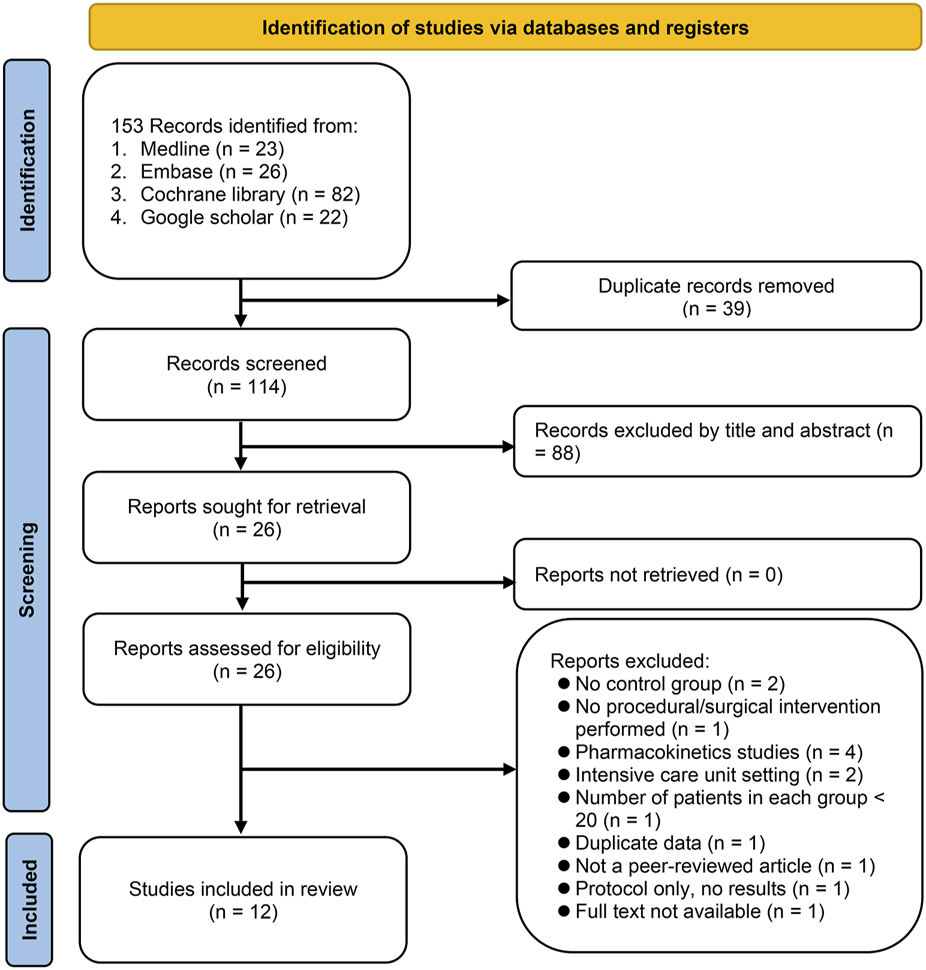FIGURE 1. From a search across Medline, Embase, Cochrane library, and Google Scholar, 153 records were identified. After deduplication and preliminary screening, 88 of 114 articles were excluded. Of the 26 articles assessed in full, 14 were excluded for reasons including lack of control group, non-surgical patients, being pharmacokinetic studies, intensive care unit (ICU) setting, or having small sample sizes. Four more were excluded for duplicate data, being non-peer-reviewed, being only protocols, or unavailable full texts.