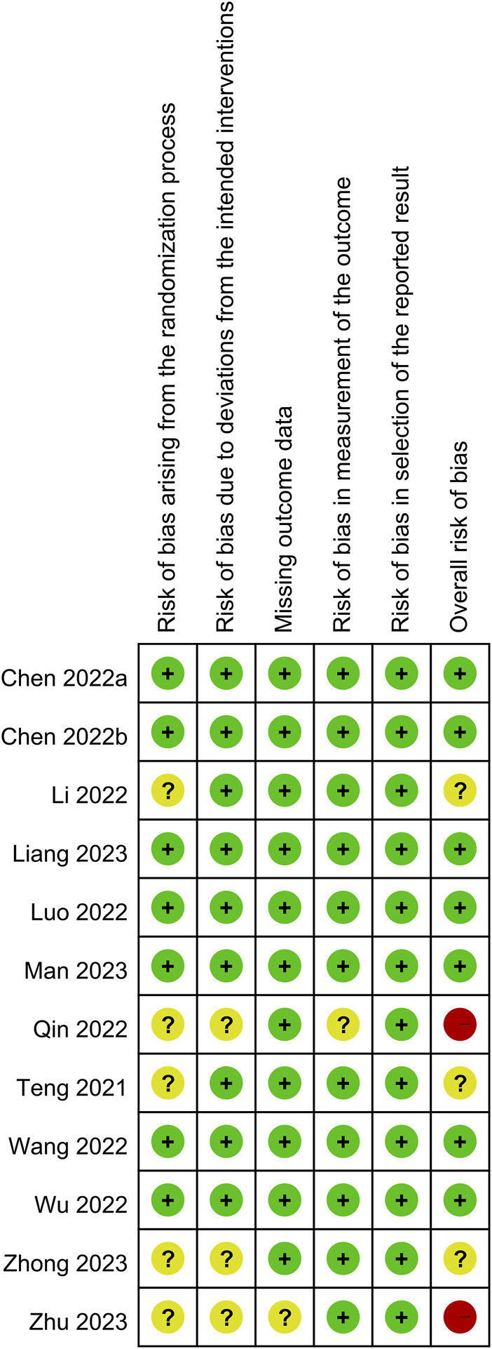 The results of an overall evaluation of all domains of bias for the 12 RCTs are summarized in Figure 2. Seven RCTs were regarded as having a low overall risk of bias (Chen et al., 2022a; Chen et al., 2022b; Luo et al., 2022; Wang et al., 2022; Wu et al., 2022; Liang et al., 2023; Man et al., 2023), indicating well-conducted studies with reliable results. In contrast, three RCTs (Teng et al., 2021; Li et al., 2022; Zhong et al., 2023) raised concerns in some domains such as the risk of bias arising from the randomization process, which led to some concerns in the overall risk of bias. Notably, two RCTs (Qin et al., 2022; Zhu et al., 2023) were deemed to have a high overall risk of bias, highlighting significant concerns regarding the validity and reliability of the findings.