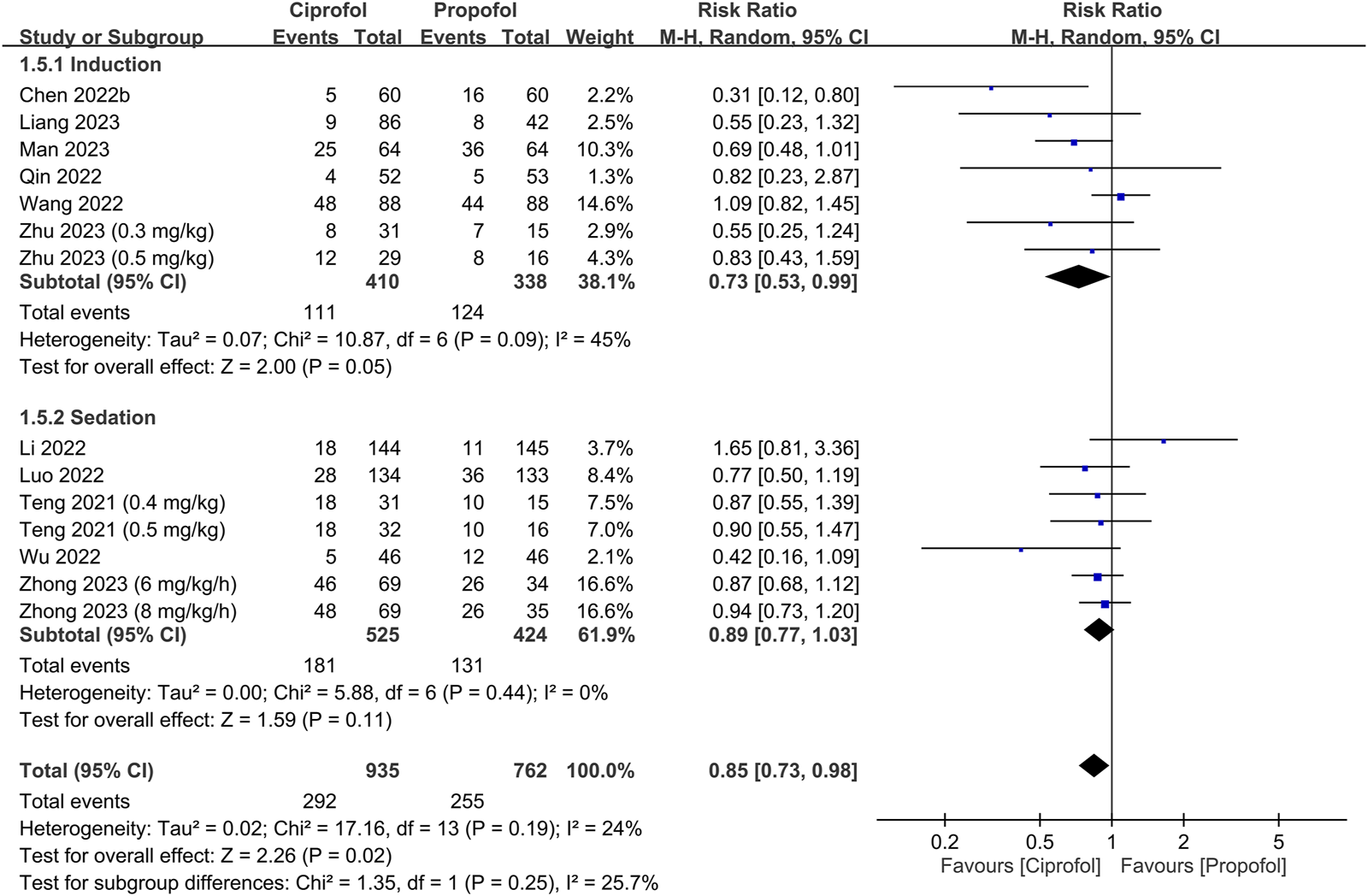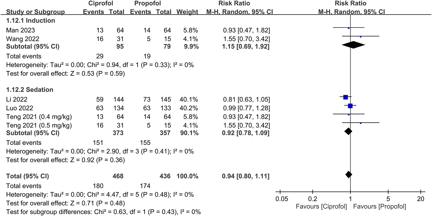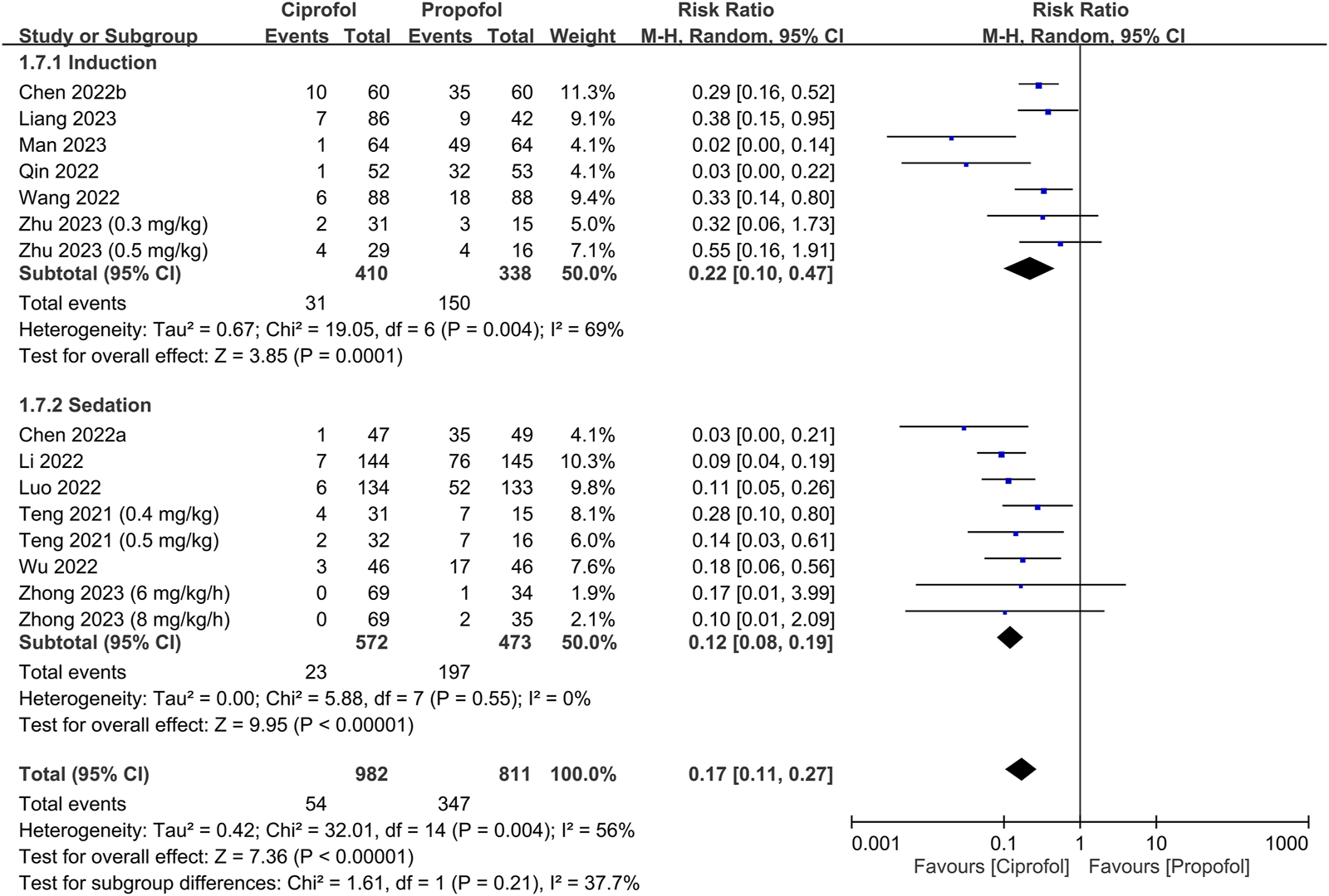 Results: Twelve RCTs (sedation: n = 6, anesthetic induction, n = 6, all conducted in China) involving 1,793 patients (age: 34–58 years) published from 2021 to 2023 were analyzed. Pooled results revealed no differences in success rate [risk ratio (RR) = 1, 95% confidence interval (CI): 0.99 to 1.01, I2 = 0%, 1,106 patients, p = 1] and time required for successful anesthetic induction/sedation [mean difference (MD) = 7.95 s, 95% CI: −1.09 to 16.99, I2 = 97%, 1,594 patients, p = 0.08]. The risks of top-up dose requirement (RR = 0.94, p = 0.48), cardiopulmonary complications [i.e., bradycardia (RR = 0.94, p = 0.67), tachycardia (RR = 0.83, p = 0.68), hypertension (RR = 1.28, p = 0.2), hypoxemia/pulmonary depression (RR = 0.78, p = 0.24)], and postoperative nausea/vomiting (RR = 0.85, p = 0.72), as well as discharge time (MD = 1.39 min, p = 0.14) and satisfaction score (standardized MD = 0.23, p = 0.16) did not differ significantly between the two groups. However, the ciprofol group had lower risks of hypotension (RR = 0.85, p = 0.02) and pain on injection (RR = 0.17, p < 0.00001) than the propofol group. The time to full alertness was statistically shorter in the propofol group (i.e., 0.66 min), but without clinical significance.