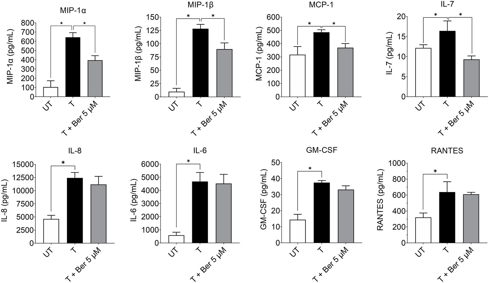 Effect of treatment with the activating mixture for 72 h on inflammatory cytokines and chemokines in the culture media collected from mono, di, and triculture conditions. Concentrations of cytokines/chemokines were determined using ELISA and 35-plex Luminex. * Significantly different at p < 0.05. UT, Untreated; T, Treated.