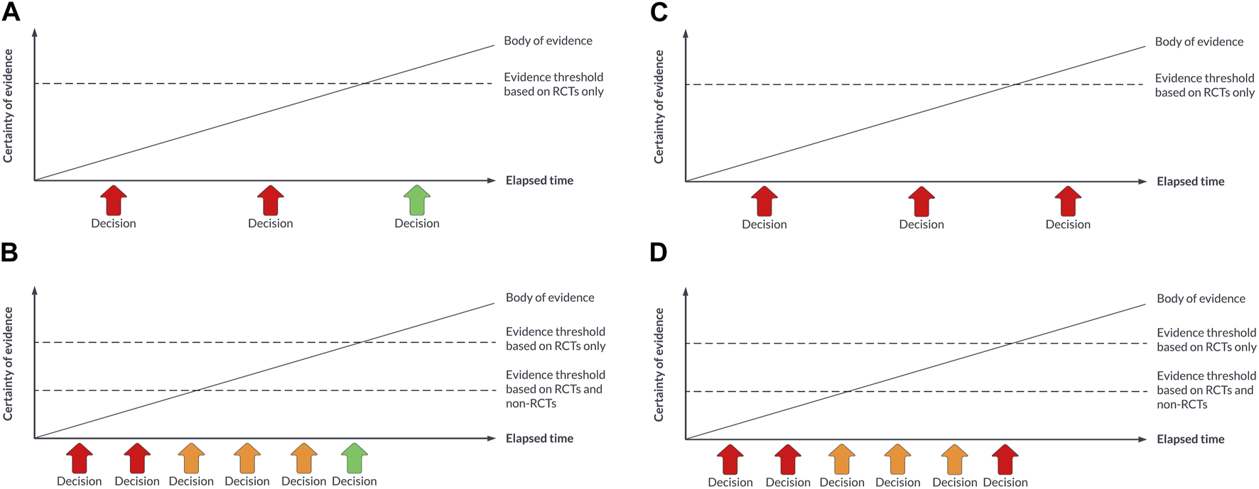 FIGURE 1. (A) Decision-making with a traditional approach to HTA for a technology that is eventually demonstrated to be safe, effective, and cost-effective. (B) Decision-making with a living approach to HTA for a technology that is eventually demonstrated to be safe, effective, and cost-effective. (C) Decision-making with a traditional approach to HTA for a technology that is eventually not demonstrated to be safe, effective, and cost-effective. (D) Decision-making with a living approach to HTA for a technology that is eventually demonstrated to not be safe, effective, and cost-effective.