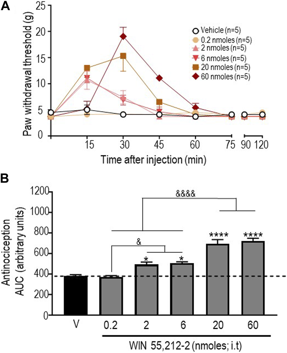 Anti-allodynic effects of WIN 55, 212-2 in STZ rats. One week after administration of STZ, rats received i.t. injections of WIN 55, 212-2 at the indicated doses. (A) Mechanical thresholds were assessed every 15 min after injection for a period of 120 min, thus allowing all responses to return to baseline. (B) Histograms show AUC (mean ± SEM; n = 5) corresponding to withdrawal thresholds integrated over 120 min and are expressed in arbitrary units. A one-way ANOVA followed by Sidak’s multiple comparison test was used to compare anti-allodynic responses. *p < 0.05 and ****p < 0. 0001 compared to vehicle; & p < 0.05 and &&&& p < 0.0001, as indicated.