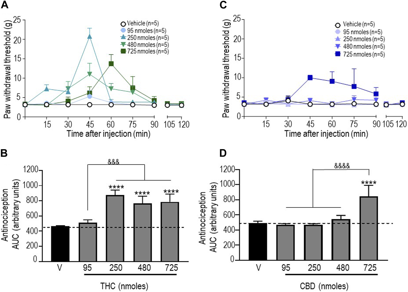 Anti-allodynic effects of THC and CBD in STZ rats. One week after STZ administration, rats received i.t. injections of (A) THC or (C) CBD at the indicated doses. Mechanical thresholds were assessed every 15 min after injection for a period of 120 min, thus allowing all responses to return to baseline. (B, D) Histograms show AUC values (mean ± SEM; n = 5) corresponding to withdrawal thresholds integrated over 120 min and are expressed in arbitrary units. A one-way ANOVA followed by Sidak’s multiple comparison test was used to compare anti-allodynic responses. ****p < 0.0001 compared to vehicle; &&&& p < 0.0001, comparison as indicated.