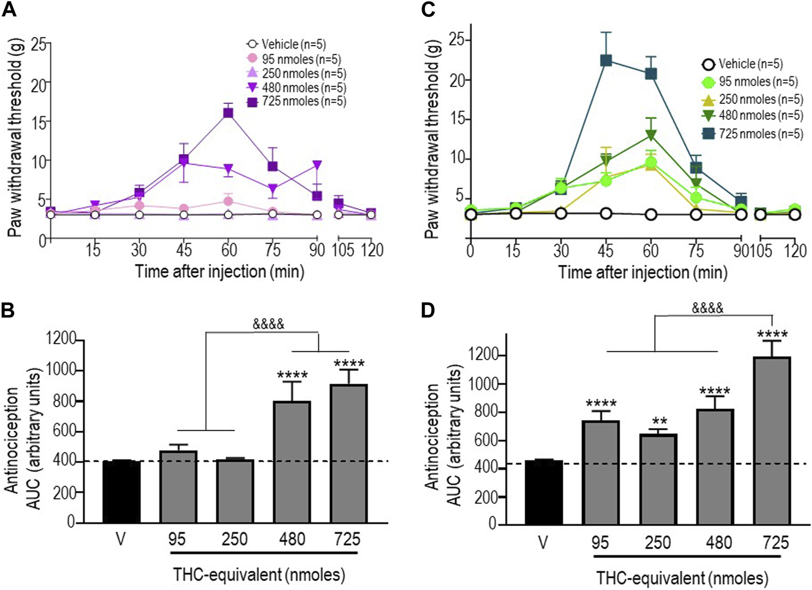 Similar analyses were completed when THC was given as an extract. A two-way ANOVA of the time course of mechanical withdrawal thresholds indicated an effect of time F (8, 180) = 30.11 (p < 0.0001), an effect of dose F (4, 180) = 23.38 (p < 0.0001), and an interaction F (32, 180) = 5.570 (p < 0.0001). The maximal response induced by this treatment was 22.46 ± 3.54 g, which was attained 45 min after the administration of 750 nmol-equivalent THC (p < 0.0001 Tukey’s test; Figure 3C). A comparison of AUC values by a one-way ANOVA also revealed a significant effect of treatment at different doses tested (p < 0.0001; p < 0.0001 for 95 nmoles; p = 0.0054 for 250 nmoles; p < 0.0001 for 480 nmoles; and p < 0.0001 for 725 nmoles).