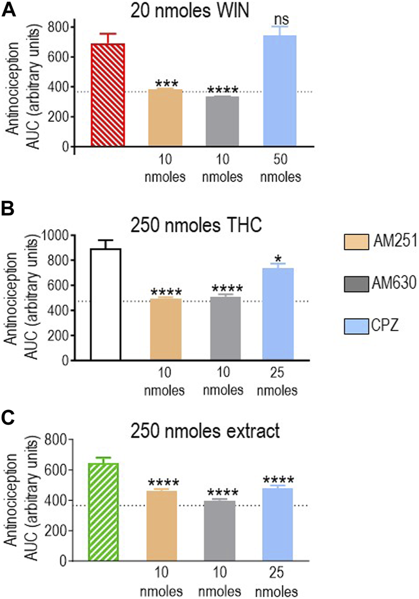 We next evaluated the effect of different antagonists on responses elicited by pure or blended THC. We had identified 250 nmoles as the lowest effective dose of pure THC. This dose effectively induced antinociception when administered as a balanced extract but not as a 1:1 mix with pure CBD (Figure 4B). Hence, we compared how CB1R and CB2R antagonists, in addition to TRPV1 blockers, influenced the effective responses elicited by 250 nmoles of THC in the products in which significant activity had been previously observed. A one-way ANOVA confirmed an effect of antagonist pretreatment both on AUC values obtained with pure THC (p < 0.0001; Figure 5B) and the extract (p = 0.0002; Figure 5C). Dunnett’s post hoc comparisons indicated that the CB1R antagonist AM251 (10 nmoles) abolished THC antinociception (p < 0.0001) and reduced that of the extract, leading to an increase of ∼26% higher than vehicle values (p < 0.0001). The CB2R antagonist AM630 suppressed antinociception by both treatments (p < 0.0001), while the TRPV1 antagonist capsazepine (25 nmoles) was also active, partially reducing analgesia by THC (p = 0.0151) and the extract (p < 0.0001). Thus, analgesia elicited by 250 nmoles of THC administered in its pure form or as an extract resembled the synthetic cannabinoid WIN 55,212-2 in its ability to engage CB1R/CB2R. Additionally, both THC-containing treatments were sensitive to TRPV1-blockade by capsazepine, which was not the case for WIN 55,212-2.