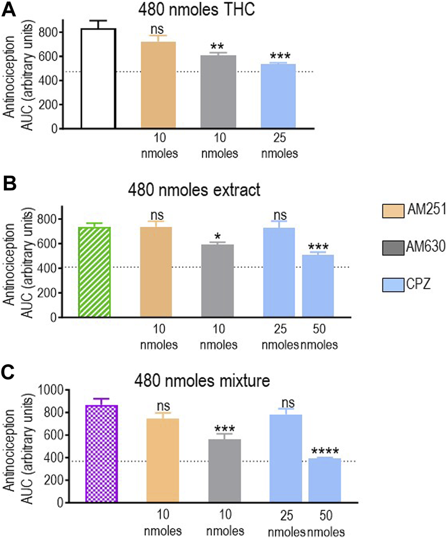 Effects of CB1R/CB2R antagonists and TRPV1 channel blockers on the anti-allodynic effects induced by THC administered in its pure form, as a 1:1 THC:CBD mix, or as the type II extract (480 nmoles). One week after induction of diabetes by STZ and 30 min before i.t. administration of (A) pure THC, (B) the balanced extract THC, or (C) the 1:1 THC:CBD mix, rats were pre-injected (i.t.) with the selective CB1R antagonist AM251 (orange), the selective CB2R antagonist AM630 (gray), or the selective TRPV1 channel blocker capsazepine (sky blue bar), at the doses indicated in the figure. Histograms show AUC values of withdrawal thresholds integrated over 120 min and are expressed in arbitrary units. They correspond to mean ± SEM, n = 6. Statistical comparisons were carried out using a one-way ANOVA followed by Dunnett’s multiple comparison test. *p < 0.05, **p < 0.01, ***p < 0.001, and ****p < 0.0001 comparing antagonist vs. no antagonist pretreatment. Dotted lines indicate AUC values obtained in vehicle-injected animals, as detailed in the Materials and Methods section.