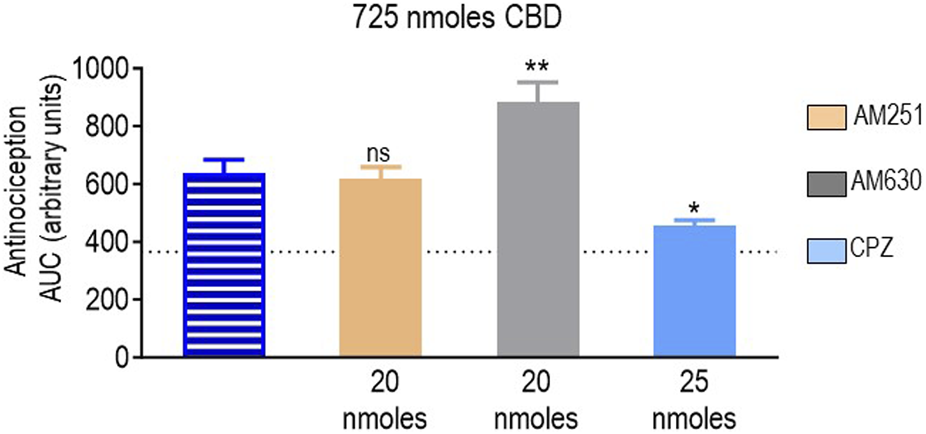 Finally, we determined how the different antagonists modified the antinociceptive actions induced by CBD at the only dose at which this cannabinoid-induced an effective response (725 nmoles; Figure 2D). A one-way ANOVA indicated an overall effect of pretreatment (p < 0.0001; Figure 7). A subsequent Dunnett’s test revealed that the CB1R antagonist AM251 did not show an effect (p = 0.9888), while the analgesia induced by CBD in the presence of the CB2R blocker AM630 was actually higher than when CBD was administered in its pure form (p = 0.0012). At 25 nmoles, the TRPV1 blocker capsazepine inhibited CBD response, leading to an increase in AUC values ∼25% higher than those observed in animals that had not received active treatment (p = 0.0182).