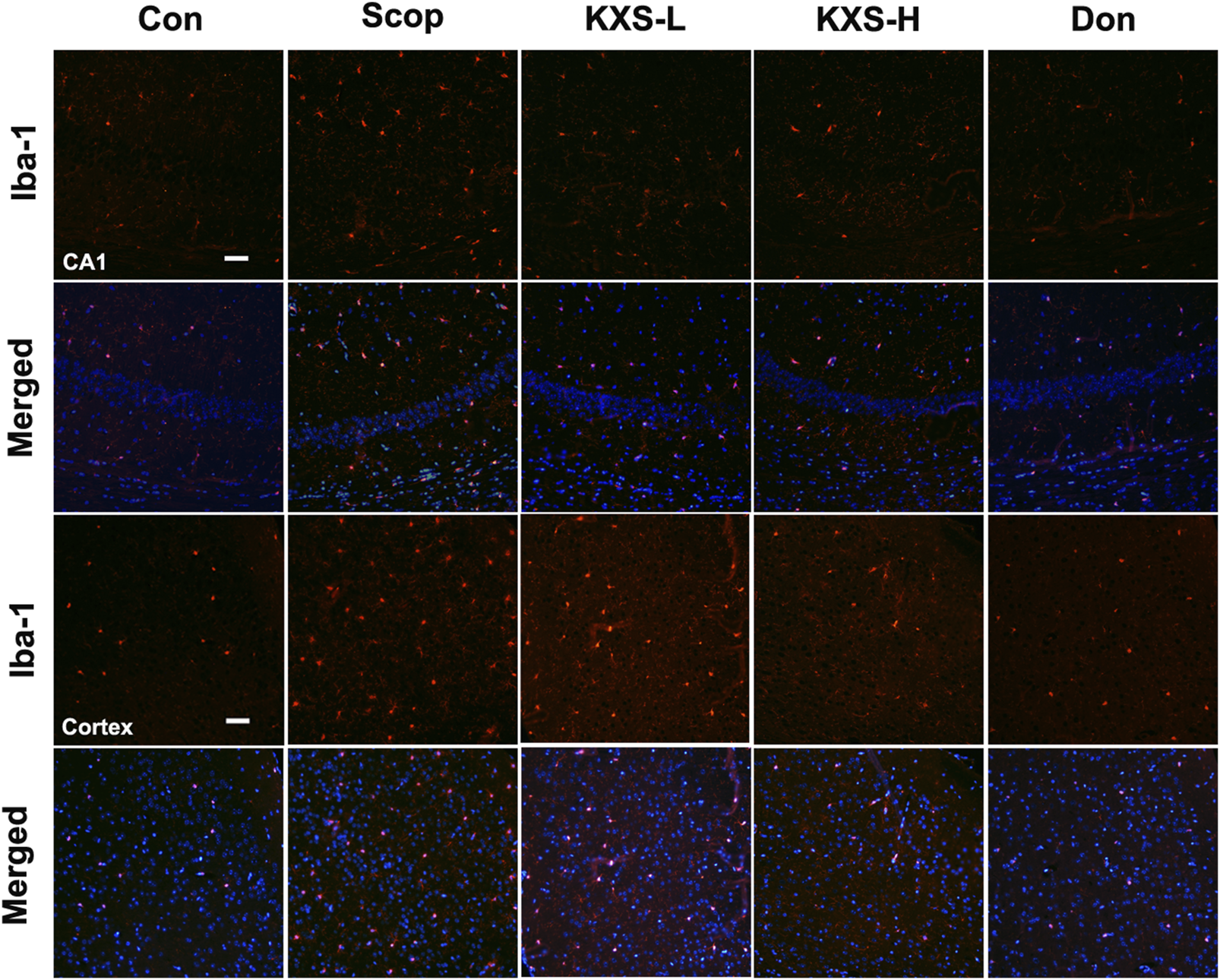 Kai-Xin-San (KXS) attenuates microglia activation in scopolamine (SCOP)-induced mice. Immunofluorescence analysis in the hippocampus (CA1) and cortex. Microglia were stained with anti-Iba-1 (red) and the nuclei were stained with DAPI (blue). Scale bar: 50 mm. Con, control group; SCOP, scopolamine; KXS-L, low-dose Kai-Xin San (1.4 g/kg); KSX-H, high-dose Kai-Xin San (2.8 g/kg); Don, donepezil.