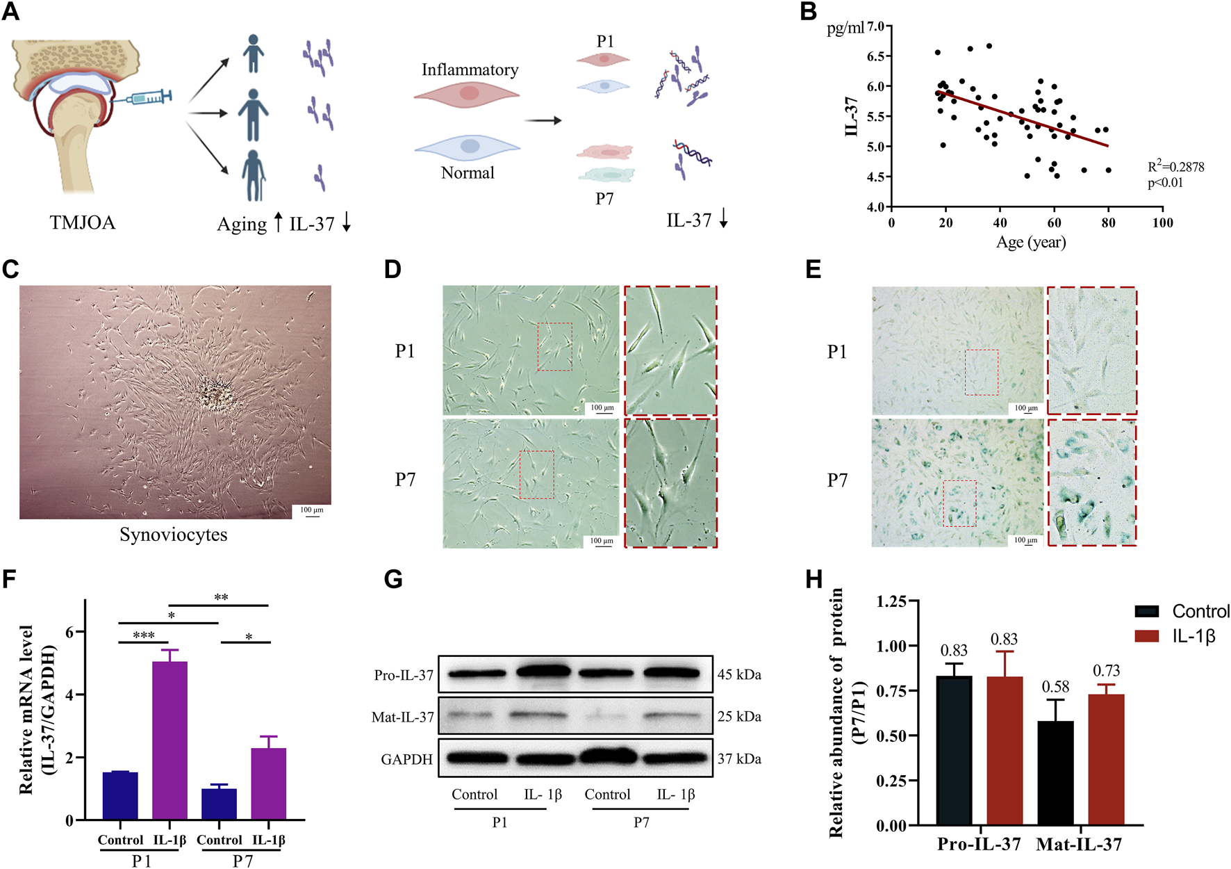 Reduced IL-37 expression in senescent sy novial cells. (A) Diagram of synovial fluid and intracellular IL-37 detection. (B) IL-37 in synovial fluid of 58 TMJOA patients was detected by ELISA. (C) Primary synovial cells were extracted by explant cultures. (D) Observation of the morphology of P1 and P7 under electron microscope. (E) SA-β-gal staining of P1 and P7 synovial cells, and aging synovial cells appear dark blue. Synovial cells were stimulated with IL-1β (10 ng/mL) for 24 h. PCR (F) and Western blot (G) were performed to detect intracellular IL-37. (H) Quantitative analysis of Western blot. The numbers above the bars indicate fold changes. Results are expressed as the mean ± S.E.M (n = 3). *p < 0.05; **p < 0.01; ***p < 0.001.