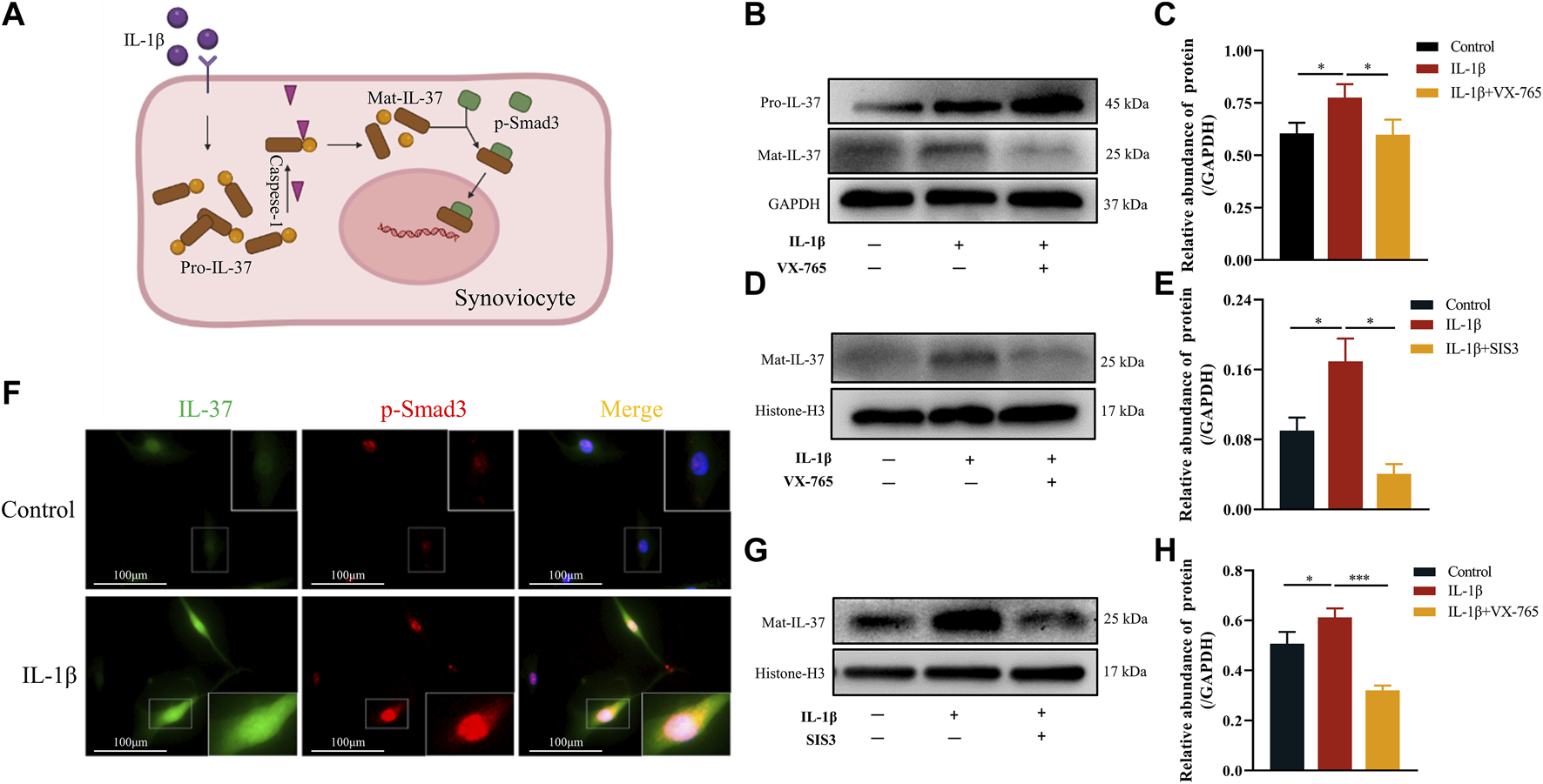 Mechanism of intracellular IL-37 maturation and nuclear translocation in synoviocytes. (A) Schematic diagram of Mat IL-37 translocation into the nucleus. Synovial cells were pretreated with Caspase-1 (VX-765, 10 μM) and p-Smad3 (SIS3, 10 μM) inhibitors for 2 h prior to IL-1β treatment for 12 h. Then Western blot was used to detect IL-37 protein levels in whole cell lysates (B,C) and nuclear lysates (D,E) (G,H). (F) The synovial cells were transfected with lentivirus to express IL-37 with green fluorescent label. Then, the intracellular distribution of IL-37 and p-Smad3 (red) was observed by immunofluorescence after 12 h treatment with IL-1β. The nuclei are stained by DAPI. Results are expressed as the mean ± S.E.M (n = 3). *p < 0.05; ***p < 0.001.