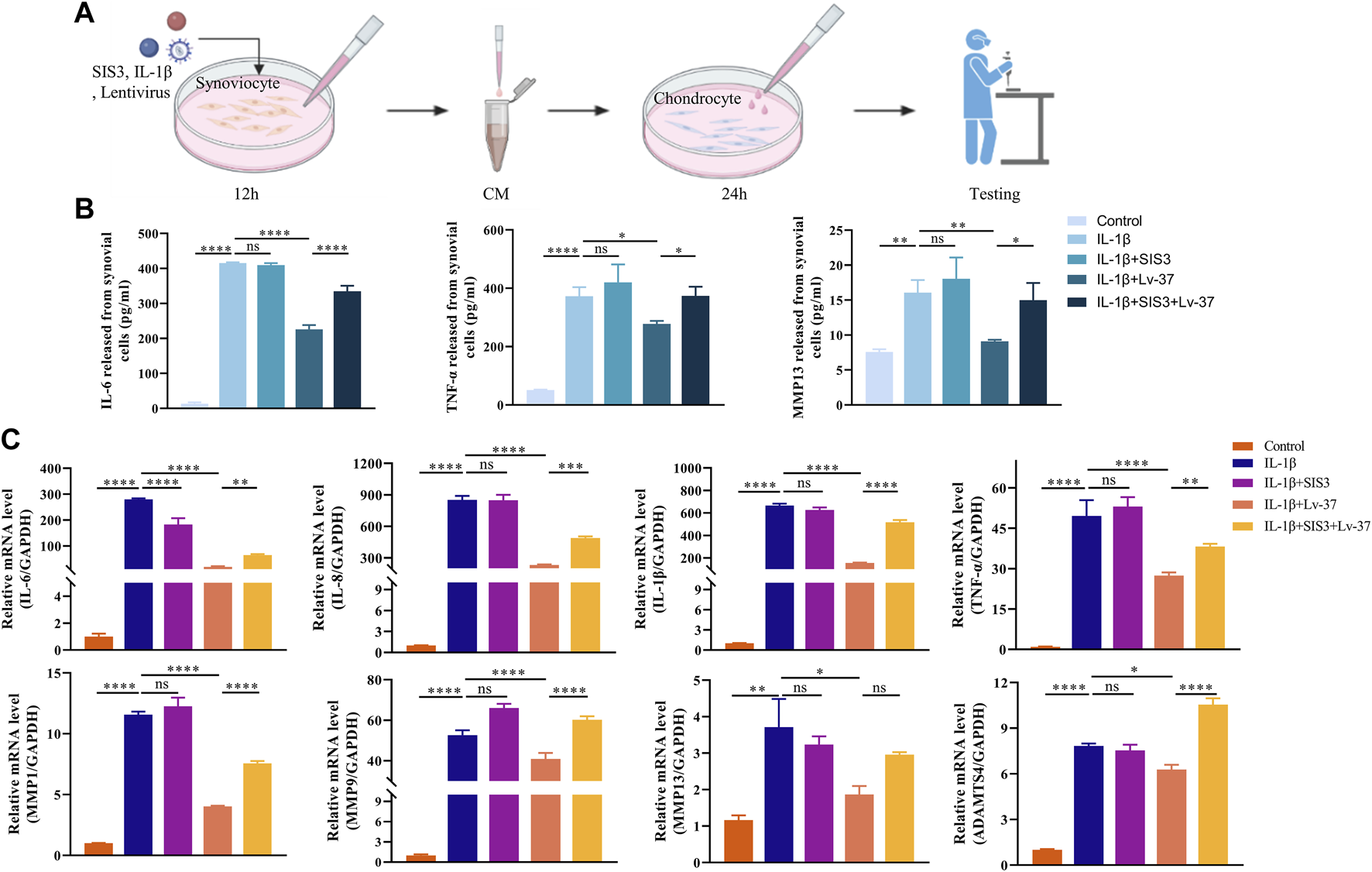 Synoviocyte conditioned medium regulates the inflammatory response in chondrocytes. (A) Conditioned media (CM) of synovial cells were collected for cartilage culture. The synovial cells were transfected with lentivirus expressing IL-37, After pretreated with SIS3 for 2h, synoviocytes stimulated by IL-1β for 12 h. Chondrocytes were cultured in the CM form synovial cells for 24 h. (B) The levels of sIL-6, TNF-α, MMP9, and MMP13 in supernatant were sdetected by ELISA. (C) PCR was conducted to measure IL-6, IL-8, IL-1β, TNF-α, MMP1, MMP9, MMP13, and ADAMTS4 in chondrocytes. Results are expressed as the mean ± S.E.M (n = 3). *p < 0.05; **p < 0.01; ***p < 0.001; ****p < 0.0001; ns, not significant.